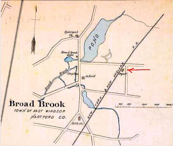 This stop is in the town of East Windsor. We can't be completely sure but this depot seems smaller to us and we have put this image here as being of the first station. The dating of the bird's-eye map is said to be between 1876 and 1880, the former date coinciding with the opening of the Connecticut Central RR whose train is coming into the station from the south. The station is clearly shown on the west side of the track. To our surprise, the 1893 Hurd map places the depot on the east side of the track. Is the mapmaker in error or the bird's-eye map artist or are both correct and there were two different stations here, a situation complicated by the fact that the val map in our next entry shows the station back on the west side of the track. For now, we are assuming that the 1893 mapmaker got it wrong. [rrd121816]