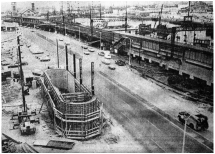 The photo at [1] shows the temporary structure that was used from February, 1904 to August, 1905. The shot at [2] shows the view from the Stratford Ave. bridge: covershed at the elevated track level and the temporary station at ground level. With the track-elevation project finally completed, the newspaper said early in 1904 that "work on the structure of this [new] station cannot be begun until the present one is entirely abandoned and torn down" and that "one by one the tenants of Bridgeport's chief relic of the past, the railroad station, have moved out," leaving only the ticket office and the newsstand which would probably move out within the week. The article went on to say that the "temporary station has been in readiness for them [for] some time" but problems with the new "overhead" tracks down by the grain elevator had prevented their use for several weeks. Apparently, extra fill was needed between the huge stone walls to stabilize this particularly soft mud-flat area. Eighteen months later when the new station was about to open, the paper said in August, 1905 that the "temporary station on the east end of the new building will be closed and removed in a few days." The paper went on to say on that "a big gang of men will be engaged in the task" that evening of transferring railroad property from the temporary station to the new one. A Courant article has given us an interesting tidbit of information on the fate of the interim station. Titled "Waterbury Gets It," it says "Another duty has been found by the New York, New Haven & Hartford road for the station that did temporary service at Bridgeport during the construction of the new depot in that city. The old station will be moved to Waterbury and is to be put up on West Main street, at the present New England road crossing." The photo at [3] is of the temporary depot reassembled in the Brass City while WATERBURY7 was being built. Thus ended the saga of the opening of BRIDGEPORT6 and of the massive construction project that elevated the tracks of the New York Division. The only image we have found of that work is seen at [4]. It is from an unidentified newspaper ca. 1940 with captioning that reads "Do you remember 'way back when -- There were 'wooden cars and iron men?' Here they are over 30 years ago, filling in the great ditch made with stone walls to elevate the tracks of the New Haven road. The location is Crescent avenue, east of East Main street and as far as the camera lens could see the 'iron men' are pitching off the dirt a spoonful at a time and in unison." With more photos like these, what a fascinating exhibit or article could be put together about this memorable chapter in Connecticut railroad history! [REFS: BEP/01/25/1904/01+; BEP/08/19/1905/01][rev102215, 121816]