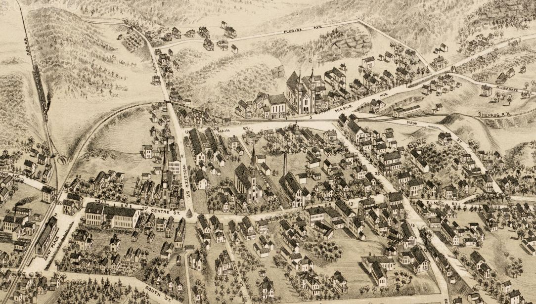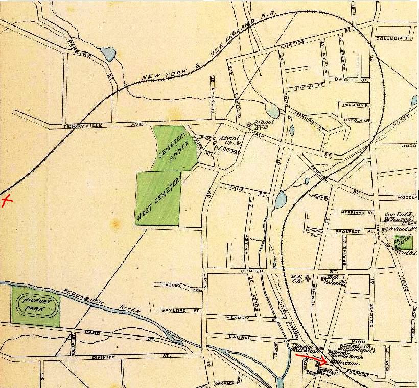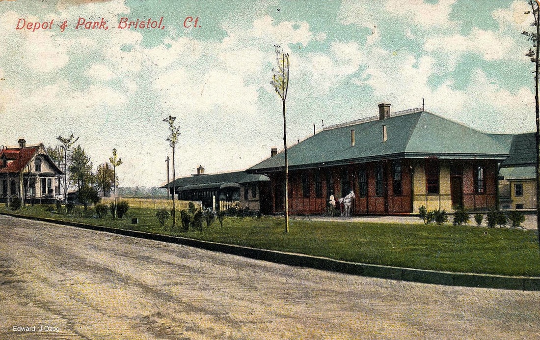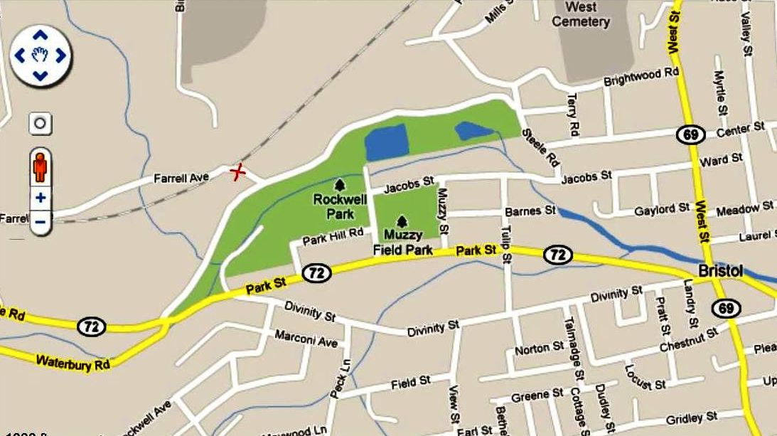 This was a minor, seasonal, and probably short-lived stop created in 1887 by the NY&NE for the new fairgrounds of the Bristol Park Association. They had taken over the Hickory Park property from the earlier Pequabuck Association who had started running an agricultural fair back in 1865. Speculation was that the revived effort was to see the railroad run a 600-ft spur into the park to deliver the animals as well as the fair-goers, but we do not see any evidence that this was done. Several newspaper articles refer to a 'fair station' from which the attendees could walk the short distance and cross the bridge over the Pequabuck River to enter the fairgrounds. We have put the red X at the likely spot for the station on all three maps, dated from left to right, 1893, 1940, and 2011. We are not sure exactly how long the fair and the horse racing that was a part of the activities lasted but Hickory Park was sold to A.J. Muzzy, a successful Bristol merchant, in 1900 and it was turned into housing lots with the adjacent Muzzy Field retained for public use. In 1914, land to the north was donated by Bristol industrialist A.J. Rockwell for Bristol's first public park. In an iconic American corporate success story, his New Departure company [click here] would start out making doorbells in 1888 and progress to bicycle components, ball-bearing products, and even taxi cabs and automobiles. Rockwell Park received an NRHP designation in 1987 [click here] and still serves the public today. Although tangential to the park, the agricultural-fair history of the land in this area is not noted at all in the NRHP nomination research. [REFS: HDC/10/10/1867/04; HDC/05/16/1887/04; HDC/09/26/1887/05; HC?09/24/1888/08; BP/08/23/1900/ 01; HC/02/24/1916/11][rrd121816]