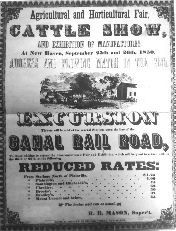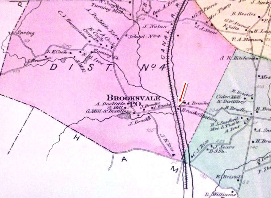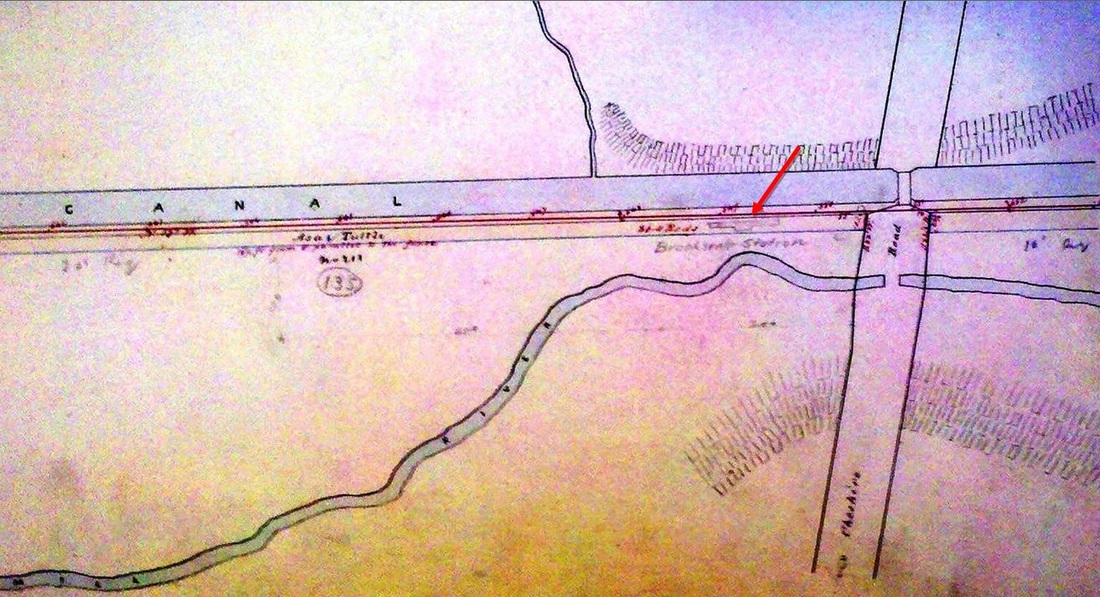 The Cheshire Historical Society has a copy of a document which reads in part that "When the Railroad went through the Brooks Farm, it was stipulated there would be a station and a mail-arm at the road crossing." The NY&NH leased the Canal line on 6/1/1848 and, following said stipulation, built a freight platform and assigned "an old baggage-car which served as a shelter for passengers waiting at the station... soon after taking possession of said road." Seen on the 1850 station list at [4], this stop was 12 miles up from Long Wharf and three miles below Cheshire. The first newspaper reference is in an 1858 fire at Julius Brooks's "extensive oyster keg manufactory" near "Brook's Station, on the Canal Road, in West Cheshire..." and an 1869 article mentions this as a junction point for the earliest incarnation of the MW&CR from Meriden to Waterbury. That railroad was to cross well to the north when built in 1888: see CHESHIRE JUNCTION. One month after the lease expired on 7/1/1869, the NH&N summarily abandoned this stop and initiated proceedings to close other less-used ones, e.g. IVES, ALLENS, on various legal grounds. Locals sued and were upheld in the courts, based on the fact that, albeit with no agent, freight was handled both ways, mail was delivered regularly and passenger tickets were sold from elsewhere to BROOKS STATION for 21 years. As it is not seen on a Register fare list in 1872, it is likely that the NH&N stonewalled until the railroad commissioners approved formal abandonment as of 6/2/1874. A September, 1874 Palladium article indicates, however, that this structure (or the subsequent one in our next listing) was in place at that time and sizeable enough for the Rev. Dr. Horton of Cheshire Academy to speak there "to an interested audience." The 1855 car seen at [1] may look like the first station, though that one was said to be only 12 feet long; we assume it was removed by the railroad ca. 1875. The 1848 NH&N real estate atlas at [2] may well show the footprint of the car and the 1868 map at [3] shows the location on the east side of the track. [REFS: 1851TT; 1858TT; 1858GED yes; HDC/02/26/1858/02; HDC/09/10/1860/02; CR/05/08/1869/04; SR/10/06/1869/05; WDA/10/06/1869/03; CR/11/20/1869/02; CR/01/01/1870/03; 37 Conn. 153, 157, (1870); HDC/07/09/1870/01; HDC/07/16/1870/01; HDC/04/22/1872/04; CR/06/08/1872/03; NHDP/09/16/1874/04; NHNAR38.1874.4; RRC9.4,24.200 (6/2/1874] [rev011015, 051022]