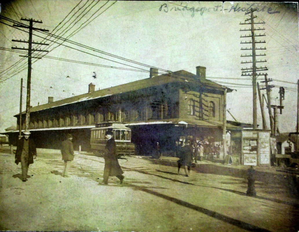 This station opened on January 1, 1861. According to the NY&NH 1860 annual report, the HRR and the NRR declined an offer to participate at "joint fair proportional expense" in the erection of a station for "the mutual accommodation of the three Companies." The NY&NH then applied to the railroad commissioners on its own for an "up-town" location at Fairfield Ave. and Water St. where the older HRR depot was still standing. The Courant said in November, 1859 that the railroad commissioners had given their approval and that the depot would be built the following spring. Some delay or other resulted in a report in September, 1860 that a "new railroad depot, 200 feet long by 23 wide, and two stories high, for the N.Y. and N.H. Railroad Company, is under contract at Bridgeport." Though there is a newspaper reference in 1867 to an otherwise undocumented Naugatuck passenger station and one in 1873 to a Housatonic depot, we assume that the other roads abandoned BRIDGEPORT2 in 1861 and began to pay rental for use of the new NY&NH depot, a union station that was never really referred to as such. In 1890, the Register reported that the charge to the HRR was a surprisingly modest $300 per year. In 1880, a 31-ft addition was put on the south end of this station to give the Adams Express Co. more space. The improvements included lengthening the platform to 550 feet and erecting a covershed over it like the one at the recently built NEW HAVEN4. The expansion seems to also have added another chimney to what appear to have been the four original ones, as seen in the ca. 1870 stereo view image at [1]. The old track arrangement is seen in it as well, with the HRR crossing the NY&NH right at the station to reach its facilities on the harbor. A later cross-over would be farther west at the grain elevator, the towering structure seen in the distance. Continuing difficulties at this crossing, fueled by corporate antagonism on the part of the NYNH&H, led to armed combat by crews and the tearing up of tracks in the late 1880s. An amicable rearrangement of deeds and property rights in 1890 left the HRR actually owning the station until the Consolidated leased the HRR in 1892 and got it back. The photo at [2] is imprinted as 1868 in other copies but we used this one to show it mistaken for NORWALK5, which had a Mansard roof unlike BRIDGEPORT3. The shot at [3] shows HRR #8 in front of the station. The other views are some time after the addition, which can be seen in the portion without the covershed on the west end. The image at [5] is probably ca. 1900 and shows pedestrians and trolley tracks behind the station on Water St. While the track-elevation project was in progress, service continued on the street level tracks until this station closed in February, 1904. [REFS: RRC2.104 (11/22/1859); HDC/11/28/1859/02; CC/12/03/1859/02; NYNHAR1860,p6; NLDC /09/14/1860/02; HDC/09/19/1860/02; HDC/10/09/1860/02; HDC/12/29/1860 /02; HDC/04/24/1867/08; PS/05/14/1873/02; NHER/10/11/1880/01; NHER/09/03/1888/04; NHER/01/13/1890/01; HC/03/03/1890/08; FCHS, p1006; SL28. 3.6+][rev102215, rrd121816]