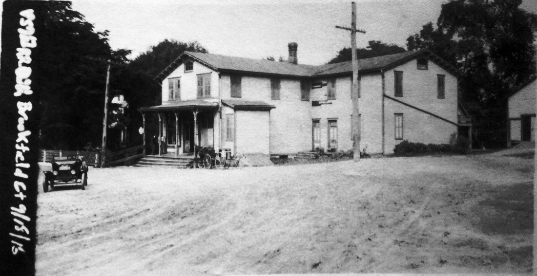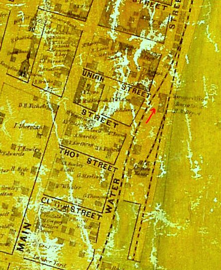 Upon reconsideration of the evidence, we are now thinking that the first passenger station in this town was in the American Hotel, on the east side of the tracks. This establishment, operated by Anthony S. Knapp in 1867, was already a landmark by that time and lasted into the next century. This Iron Works District stop was said to have handled mostly freight but there also had to be passenger service here from the start of the HRR in 1840 as it appears on the earliest timetables. The hotel-station arrangement is borne out in the 1864 Courant article that said "A fire, which took in a store in Knapp's hotel building, Brookfield, Thursday night, communicated to the railroad, telegraph and post offices in the same building, doing quite extensive damage. -- Building saved." It was not unusual for early HRR stations to be in hotels; we have confirmed instances elsewhere with MERWINSVILLE1, CANAAN1, and possibly STEPNEY1. Also supporting the hotel as station is the fact that neither the 1856FC map at [2] nor the 1867 Beers map at [3] indicate any actual passenger depot. Both show Knapp's American Hotel [red arrow] and the latter also shows the freight depot [blue arrow] just up the track. In the photo at [1], the hotel is the large building in the extreme right. Shorn of its third floor perhaps after the 1864 fire, the railroad must have purchased it at some point since it is seen as NYNH&H property in the 9/18/1916 val photo at [4]. [REFS: HDC/03/28/1864/01][rev122217]