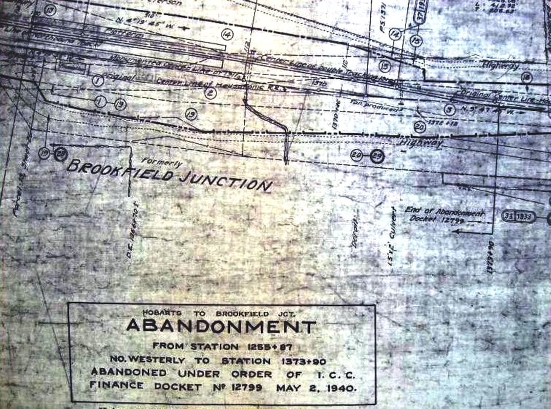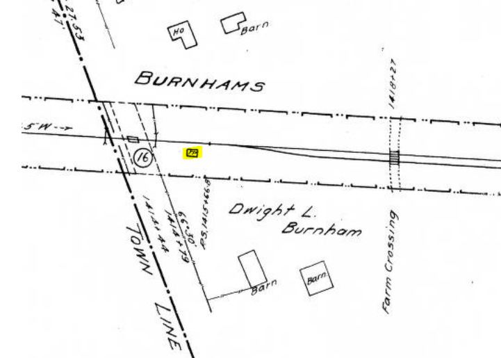Store-like in appearance, this structure was for many years erroneously considered to be the first station in this town. Various undocumented sources claim that this structure was destroyed by fire and/or was later sold to the Brookfield Iron Works. Foldered R&LHS material at the Baker Library includes a 6/22/1887 statement that shows this building as privately owned by Henry S. Beers who was being paid $5 per month rental for use of it as a passenger depot. However these factors play into the history of the structure, it is seen at [1] still standing and as railroad property in a 9/15/1916 val photo, out of service after BROOKFIELD3 was built but still sporting its old signboard. In the shot at [2] it is seen at the red arrow behind BROOKFIELD3. The 1912 real estate map at [3] shows this station still in place before the track changes that would abandon about a half mile of the old HRR in favor ot the new double-tracked alignment. [REFS: RRC6.11 (5/16/1868: depot repairs); B891] [rev122217]