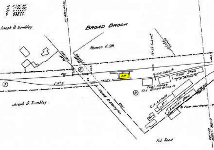 This stop is in the town of South Windsor. The 1915 val map shows just a platform here on the east side of the track and adjacent to the East Windsor Brick Co. This was not an original station on the Connecticut Central when it opened in 1876 and we do not yet know precisely when it was established, but it is on our 1907TT as a flag stop for one of the two trains daily each way between Hartford and Springfield on this branch. [rev071615, rrd121816]