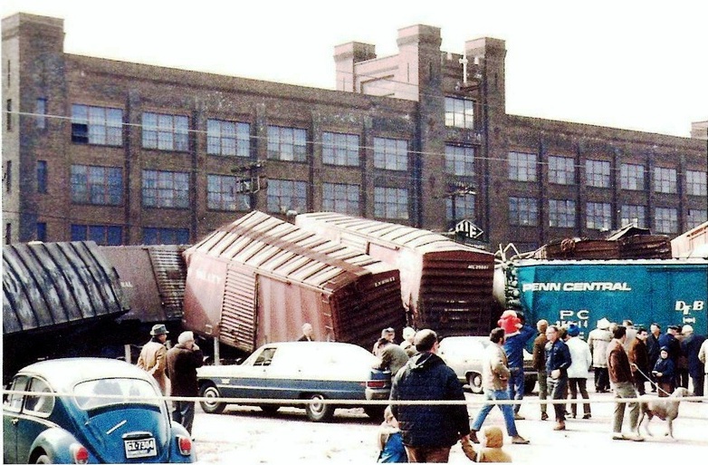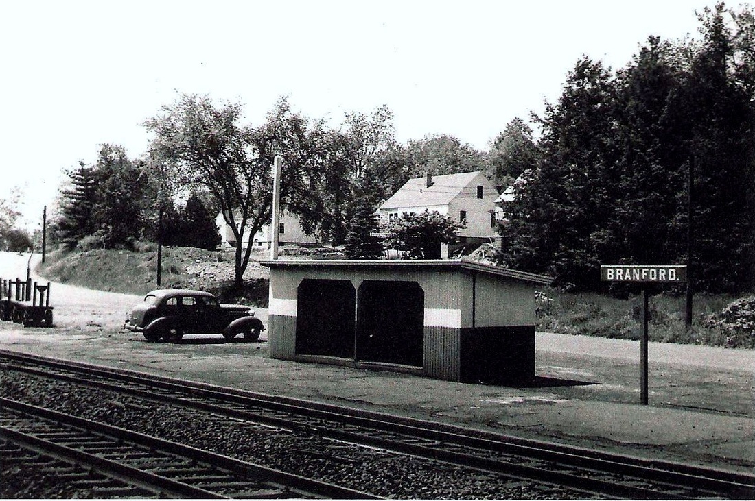 The grandeur, however faded, that was BRANFORD3 was replaced by a small wooden box. A brief article on the front page of the BREHN read on 3/21/1940: "New R.R. Depot. A small building is being erected next to the present Branford Railroad station. The New Haven Road decided some time ago to demolish the present structure , it having out lived [sic] its usefullness [sic] and being in need of repair." The photo at [1] was taken by Charlie Gunn in the mid-1950s and the aerial shot at [2] shows the outline from the sky in 1965. The dating of the image at [3] might be better judged by people more familiar with the variety of vintage automobiles but may be from the 1960s. BRANFORD4 met its own end when the Courant reported in 1970 that the "old Branford depot" was demolished by a Boston-New York freight train that derailed on 3/22/1970, with 25 of the 86 cars leaving the tracks that were torn up for a quarter of a mile. A boy who had just waved to the engineer heard the crash seconds later and said it "sounded like the end of the world." The aftermath is pictured at [4]. [REFS: HC/03/23/1970/02; BREHN/03/21/1940/01][rev111114, 122818]