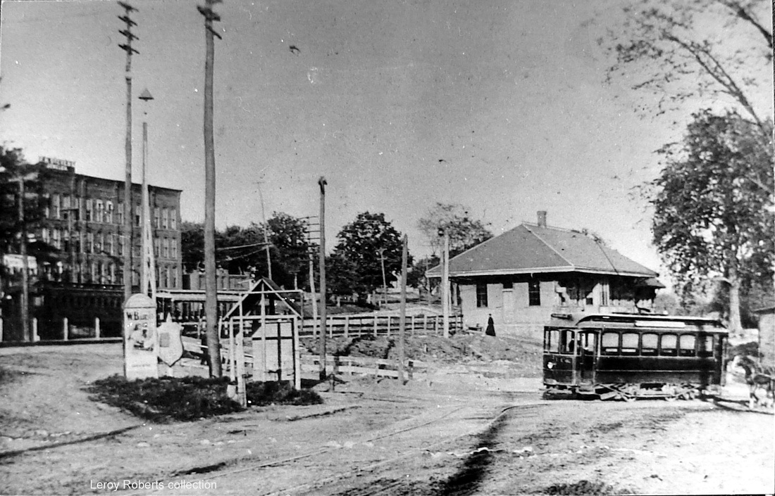 Impatient for the new station, the Bristol Weekly Press was quoted in February, 1887 as wondering "what about that fine new depot that was to be built?" and further saying humorously that, if the derelict, soon-to-be-replaced NEW BRITAIN1 was being brought here by the NY&NE, there should be a vigorous protest! The contract for Bristol's new station was signed on 4/25/1887. An original copy can be seen in the Bristol History Room at the city library, which is well worth a visit. When BRISTOL3 opened on 10/1/1887, the Press noted it with just a single sentence: "The depot came into use last Saturday." The "incandescent electric lamps" touted in a previous article notwithstanding, there was considerable envy and resentment of the magnificent, towering brick edifice with porte cochere in New Britain that so overshadowed Bristol's simple, one-story depot. When it came time in 1898 to re-position BRISTOL3 for arrival of the third-rail cars, the paper said with dripping sarcasm that "Bristol's elegant passenger station, in which we all take so much pride, is to be moved across the tracks next Sunday. The regrettable feature is that it is to go only a few feet south. The advisable thing to do, when once it got started, would be to keep it on a southerly course until it reached Cuba. It could then be covered with corrugated iron and converted into a place of detention for Spanish prisoners. Then Bristol would take a pride in it that was not ironical. However, the building will do duty for years, probably. Mr. Fred Linstead has the contract for moving it." References to the Spanish-American War aside, the town was not happy with its depot! Another sore subject was the dangerous Main St. grade crossing and an 1899 Courant article gives details on that. In 1889, a law was passed stipulating that railroads in the state had to eliminate one grade crossing annually for every 60 miles of mainline track operated. The NY&NE failed to satisfy this requirement in 1891 and the railroad commissioners, acting within their statutory powers, chose this crossing to be eliminated to make up for the others not done. The then-estimated $100,000 cost led the NY&NE to fight the order and challenge the borough of Bristol all the way to the U.S. Supreme Court [click here], which in 1894 upheld the statute and affirmed the commissioners' actions. The new lessee of the line, the NYNH&H, still had to be prodded to undertake the massive excavation to lower Main St. When the new iron bridge was completed on 1/1/1901, the project was finally finished. The shot at [1], from the George E. Norris bird's-eye map of 1889 [click here], shows the depot shortly after it opened in its new location, northeast of the Main St. crossing. The val photo at [2] is dated 8/21/1916 and the dotted lines on the 1916 val map at [3] reflect the realignment of the right of way in 1900. The post card view at [4] shows Prospect Park created in 1906 from the land where the tracks once were. The historic shot at [5] dates to between 1898 and 1900 and shows the agent's bay temporarily not at trackside! How that was addressed on the other side of the building is not yet known because the old tracks on the north side of the depot, which show a third-rail electric car here, would not be relaid south of the station until November, 1900. In March, 1954, the Press reported that BRISTOL3 been had been purchased from the NYNH&H on 10/26/1953 by developer Allen M. Heflin who sold the land, including the park, to some local banks. With accommodations made for passengers at the freight station across Main St., BRISTOL3 passed through a succession of humble uses in the 1960s. It opened in 1970 as the Iron Horse and later the Bristol Station Restaurant, flanked by two rail cars, one of which was the former Merchants Limited diner. The last operation closed about four years later and fire struck the dining car on 8/8/1975. The depot was spared the flames but was said at the time to so little resemble a station inside as to not be worth preserving, though the local historical society made some efforts. It was razed, in an altogether too familiar scenario, for a parking lot. Demolition began on 5/15/1976. The photo at [6] shows the depot after it was closed in April, 1954. The stairway that was necessitated by the 1900 excavation project and was only covered in 1911 after numerous slip-and-fall incidents, is now boarded up. The gabled structure to its left on the sidewalk housed a stone drinking fountain, a public amenity built in 1901 on a patch of land leased to the city by the NYNH&H. In the contract, also in the Bristol History Room, it specifies that "the lessee shall pay as rent the sum of one dollar on the 8th day of every August," probably just enough to make it all legal and symbolically conclude decades of public complaint, legal action, and belated railroad improvement in Bristol. [REFS: NHER/03/20/1886/01; HDC/03/22/1886/03; CRC35.1887.16; HDC/02/05/1887/04; BWP/03/10/1887/04; BWP/03/17/1887/04; HDC/06/23/1887/04; BWP/09/29/1887/04; BWP/10/06/1887/04; BWP/06/16/1898/01; HC/06/16/1898/11; HC/10/25/1899/05; HC/11/15/1899/03; BRP/11/11/1900/01; HC/11/24/1900/12; HC/12/08/1900/12; HC/01/02/1901/10; HC/08/23/1901/16; BRP/03/29/1906/02; HC/07/29/1911/18; BRP/03/10/1954/??; BRP/01/23/1960/01; HC/10/04/1970 /20J; HC/08/10/1975/2B1; HC/02/25/1976/61B; HC/04/03/1976/25A; BRP/05/15/1976/01; D130][rev011417, 110420]