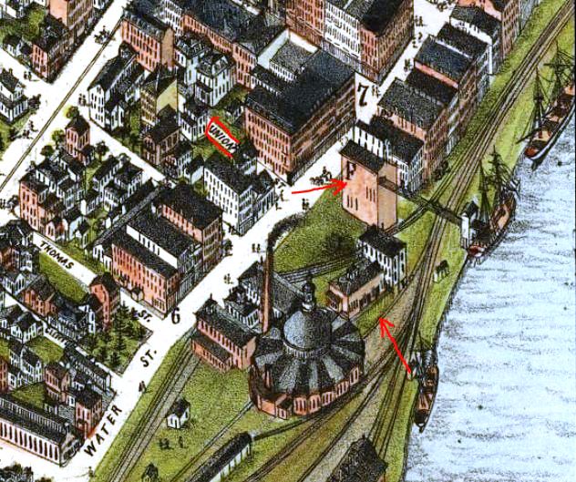 According to Orcutt, the HRR opened "... commencing at a point near the west approach to the Bridgeport bridge -- Fairfield avenue -- it extended northerly across the mud flats over [the] Porter property... secured the entre point east of its main line... located their engine house, turn-tables and car-shop thereon..." The Sidney & Neff map at [1] is dated 1850; the upper red arrow points to the HRR facilities at Porter Point, identified by Orcutt as the location of Samuel Porter's farm at the foot of Gold St. The lower arrow points to where the track first commenced at Fairfield Ave. and was extended south to the steamboat dock in 1841. Fairfield County Historical Society records [click here] say that "... about 1846 the Housatonic Railroad company removed their depot for both for passenger and freight from near Fairfield avenue southerly to a point near the present elevator." Snippets [2] and [3] are from the Bailey 1875 bird's-eye map [click here]. The Porter farm location is seen in the former. The right shaft of the double arrow points to what FCHS calls the "long car house" that remained here for years after 1846 and the left shaft points to a small structure that we have discounted as being the first depot because it is too small and a bit too far from Fairfield Ave. The single red arrow on both snippets points to what we think was the first HRR depot, shown just north of the 1861 station, BRIDGEPORT3. Late in 1860, when that station was about to open, the Courant referred to the old one as a "shanty" and in 1879, the Journal Courier reported that "the old passenger depot of the Housatonic railroad in Bridgeport is being torn down." While both may refer to the larger BRIDGEPORT2, it is perhaps more likely that this small structure is the one they meant, possibly being used by the NY&NH after the HRR vacated it and in later days for a baggage and express office for all three railroads. It is worth noting that Mr. Bailey has once again come to the rescue with a representation of Bridgeport that we may never have had otherwise and that includes an accurate rendering of the 1848 swing-span bridge, the first of the four that the railroad would use to cross the Pequonnock River, as well as the Park City's old Congress St. bridge to the north. [REFS: BR/06/21/1841/103; HDC/12/29/1860/02; NHJC/08/12/1879/02; FCHS Reports and Papers, 1882-1897, p152,154 (Porter: see p6,7); Samuel Orcutt, A History of the Old Town of Stratford and the City of Bridgeport, Connecticut, 1886, 1.499,553][rev030115, rrd121816]