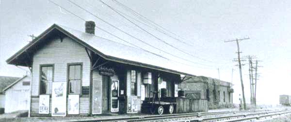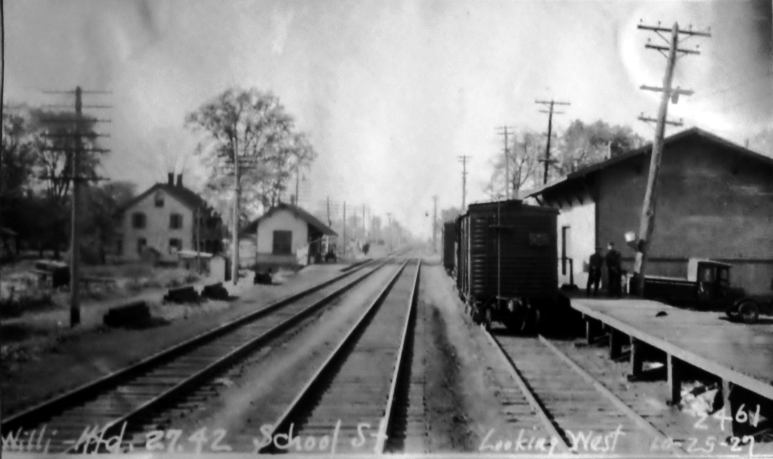 The 1915 val map shows the arrangement of the station grounds and adjacent area at that time, the depot being on the west side of the track. The middle photo is Lewis H. Benton #2361 taken in 1929; Irving Drake's sedan in view at right. A gas-electric car was handling a mail sack at the time of the duo's visit. Both photos look south. If this, in fact, is a station subsequent to 1876, we do not have a build date. [rev121816]