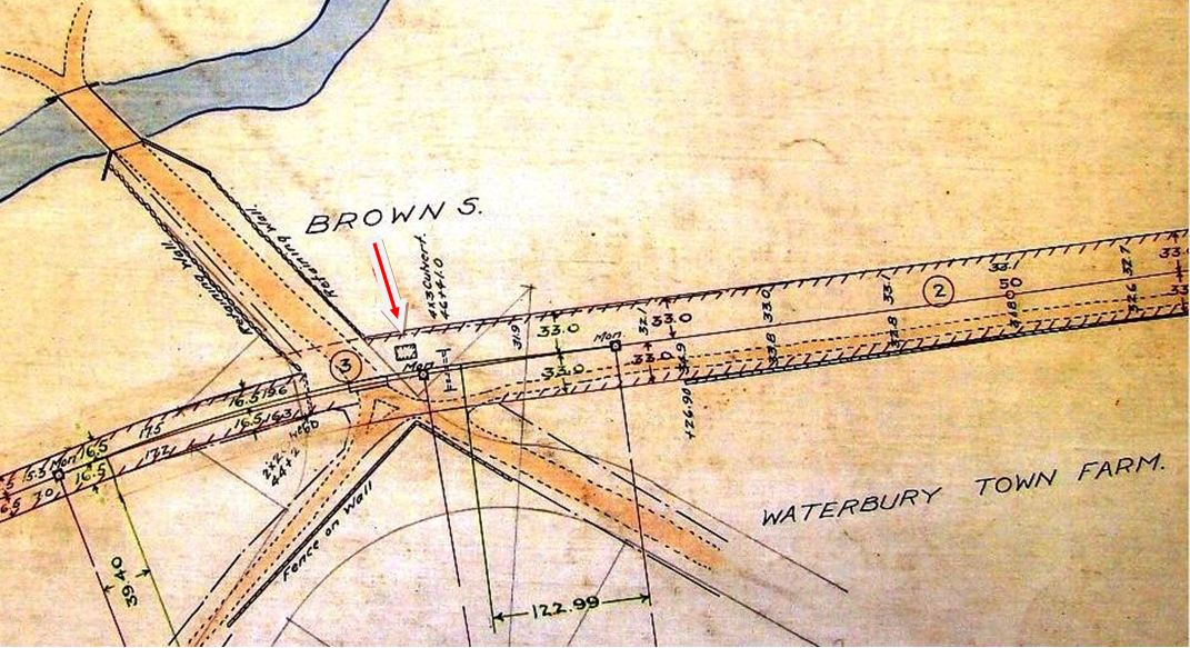 This was a stop in the town of Waterbury on the Watertown branch, the former W&W. Though no passenger is seen waiting, the flag is up in the 8/29/1916 val photo at [7]. The station makes its first appearance on the rev07/19/1898TT seen at [1] and lasted through our 12/2/1923TT and probably until passenger service ended on the branch around 1925. According to Henry P. Stearns's 1980 Shoreliner article, it was located in far northeast Waterbury just below the Brookside Home, the social services facility that once stood near Waterbury's Municipal Stadium. Various maps show the station sat in the northwest quadrant of the crossing at Huntingdon Ave. The home was probably built on the site of the old Waterbury town farm, the almshouse, as shown on the 1912 NYNH&H real estate map at [2]. That institution dated back to 1839 and in 1870 was permitted to give up some of its land for the W&W, which is seen in passing in front of the property in the card at [3]. The style of the shed matches others on the NRR at REYNOLDS BRIDGE and WELTONS, the latter being farther up the branch. The shots at [4] and [5] were taken in 2011; track was still in the ground running north from the station site. According to a Courant article, a new station was to be built here a half mile south of the old one in 1918 but we do not know why or if it was in fact ever built. The new location would have been at East Aurora St.; the stub-ended Watertown Branch still serves a scrap dealer today just short of that street. Our Track 12 GE map at [6] shows the location today. As a result of this review, we have de-listed BROWNS2. [REFS: 1894TT: no; 1896TT: no; CWN/10/26/1899/03; HC/07/20/1918/03; D99; K63; SL11.2.24][rev122217]