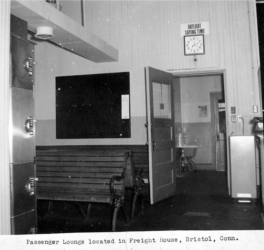 With BRISTOL3 sold in 1953 and soon to be out of railroad service, other arrangements had to be made. The decision was to turn the freight house across Main St. into a combination station like the old days. The Press of 3/10/1954 said that the railroad had until April 26 to make room in the freight house for the ticket office, Railway Express Agency, and the taxi operation. The result is seen in the photo at [1] The lounge, seen in the photo at [2], served as the final passenger station in Bristol until the last Budd car pulled out in 1960. The coversheds at [3], which we have seen in a much earlier val photo, pre-dated these changes. The freight station itself would later become a source of friction between the railroad and the city until it was torn down by Conrail in 1977. [REFS: BRP/01/23/1960/01; HC/04/23/1977/27; HC/08/02/1977/19A][rev081313, 080619]