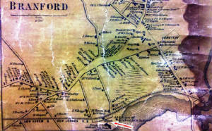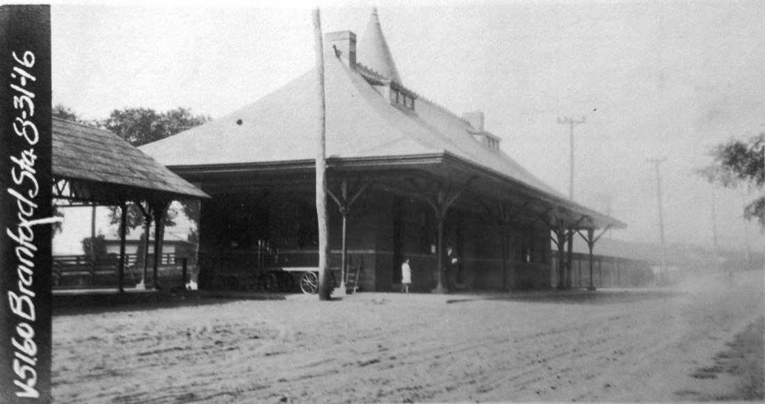 The 1852NH map at [1] already shows the NH&NL that opened in July of the very same year but does not yet indicate a station here. How reliable this is as an indicator is unclear but, in fact, this map does show a depot in place for MADISON and other towns. Rockey, on the other hand, states that "when the road was completed, in 1852, the station was located at the foot of Montowese street, where was also the village wharf." He continues on to say that "a few years later Elizur Rogers began his improvements at Page's Point, opening a new street to that place from Main street, in the old village, and the depot was soon after located west of Page Point wharf." The map at [2] dates to 1856 and shows the depot south of the track at the new location. Since the earlier map shows no depot, we are going out on a limb in thinking that the Andrews residence there at the foot of Montowese St. [red arrow] may have served as BRANFORD1 until an actual structure was built as BRANFORD2. Many thanks to Jane Bouley of the Branford Historical Society for the photos, maps, and data, much of which we have incorporated into this examination of the town's railroad stations. Would that we had such luck, assistance, and success everywhere! [REFS: K95; R2.26; rev111114, rrd121816]
