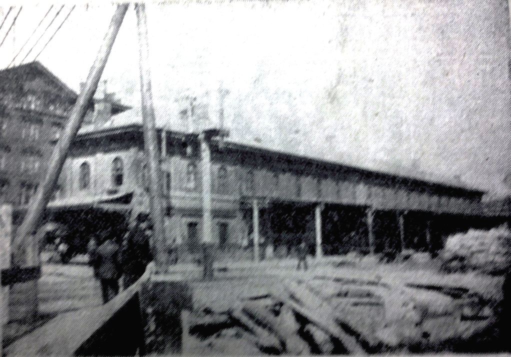 This undated sketch shows the street-level station on the eastbound side of the tracks put up by the NYNH&H in late 1891 or early 1892. This was occasioned by the release of BRIDGEPORT3 to the HRR after which there was the expectation that the NYNH&H would build its own new station. The Palladium ran a small item in October, 1891 saying that published reports that the NYNH&H was about to build a completely new depot "more costly and elaborate than any other on the road" had been denied by General Mgr. Tuttle. He said nothing would be done about a permanent structure until the four-tracking and elevation project was completed. In the meantime, however, he did say that the company was going to erect a "temporary wooden depot on the south side of the tracks, something after the plan of the depot at Westport" to afford comfortable accommodations to travelers taking trains across from the main station. It was expected to cost about $4,000. For this purpose, Tuttle said in July that the NYNH&H was going to purchase land between BRIDGEPORT3 and the Pequonnock River from the Miller and Strickland Co. coal dealers. In the sketch, all we can see is the covershed. Whatever stood here was expanded or replaced by BRIDGEPORT5 and later BRIDGEPORT7. [REFS: TR/08/23/1891/04; NHDP/10/07/1891/??; HC/04/03/1891/06; HC/07/14/1891/06][rev102215]