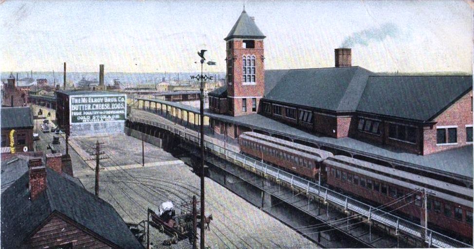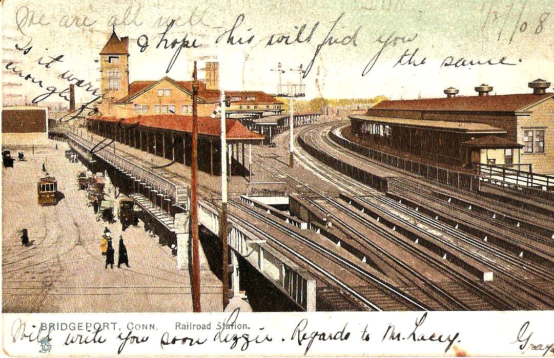 Ground was broken on 4/4/1904 for this station to replace the Civil War-era BRIDGEPORT3 and to accommodate the new elevated, four-track main line. That $4M project had just been finished, with the first train running above the streets on 1/31/1904. BRIDGEPORT6 would not be ready until more than a year and a half later, opening on 8/20/1905. The foundation for it was granite and the exterior was buff brick. A 115-ft tower at the Golden Hill St. side of the station was adorned by four copper gargoyles and a red slate roof topped the entire Romanesque structure that was designed by architect Warren R. Briggs. A street-level tunnel connected the main station with the eastbound platform and a long ramp up from Fairfield Ave. on the south end served, more or less, as the main entrance. The 160x70-ft waiting room had terrazzo and marble floors and a painted metal ceiling. There were freight, passenger and express elevators and over a thousand electric light bulbs illuminated the station and its surroundings. These improvements also included the opening of a new rolling lift drawbridge over the Pequonnock River. Until the old bridge was demolished, the swing span was left open, eliminating the old walkway and forcing pedestrians to use the Stratford Ave. or Congress St. bridges. As impressive as this station was, it was later said to have been too small and outdated within a decade. In the 1950s, Pres. McGinnis said it should be blown up(!) and a new station built in East Bridgeport where there was more room for parking. In derelict condition, this station was closed on 6/7/1973 and was being considered for refurbishment and other uses when an arson fire destroyed it on 3/20/1979. The view at [1] looks east with the old HRR line diverging to the north, an arrangement that caused the station platforms to be built in a unique V shape. The red arrow points to SS 28, Fairfield Ave, the tower built in 1904. According to retired tower operator Dale Martin, this was eliminated when SS-60 debuted on the bridge just east of the station. The post card at [2] is dated 9/8/1907 and shows the McElroy Bros. building on Water St. The same structure is seen behind Pres. Theodore Roosevelt at [3] when he spoke spoke to crowds at the north end of the HRR-side covershed on 6/29/1905. Electric operation began as far as Stamford on 10/6/1907 and was extended to New Haven by June, 1914; wires are up in the eastward view at [4]. The val photos at [5], [6], and [7] are dated 8/29/1917. [REFS: HC/07/17/1903/09; HC/08/07/1903/14: new bridge; BEP/02/01/1904/00; BEP/03/04/1904/00; HC/05/06/1904/15: old bridge being torn down; HC/06/30/1905/10; CRC53.1905.25; BEP/08/14/1905/00; HC/08/15/1905/05; BEP/08/19/1905/01; NYT/10/05/1907/04; NYT/06/18/1914/30; HC/03/21/1979/1A; NL19.1.8; R36][rev102215, 121816]