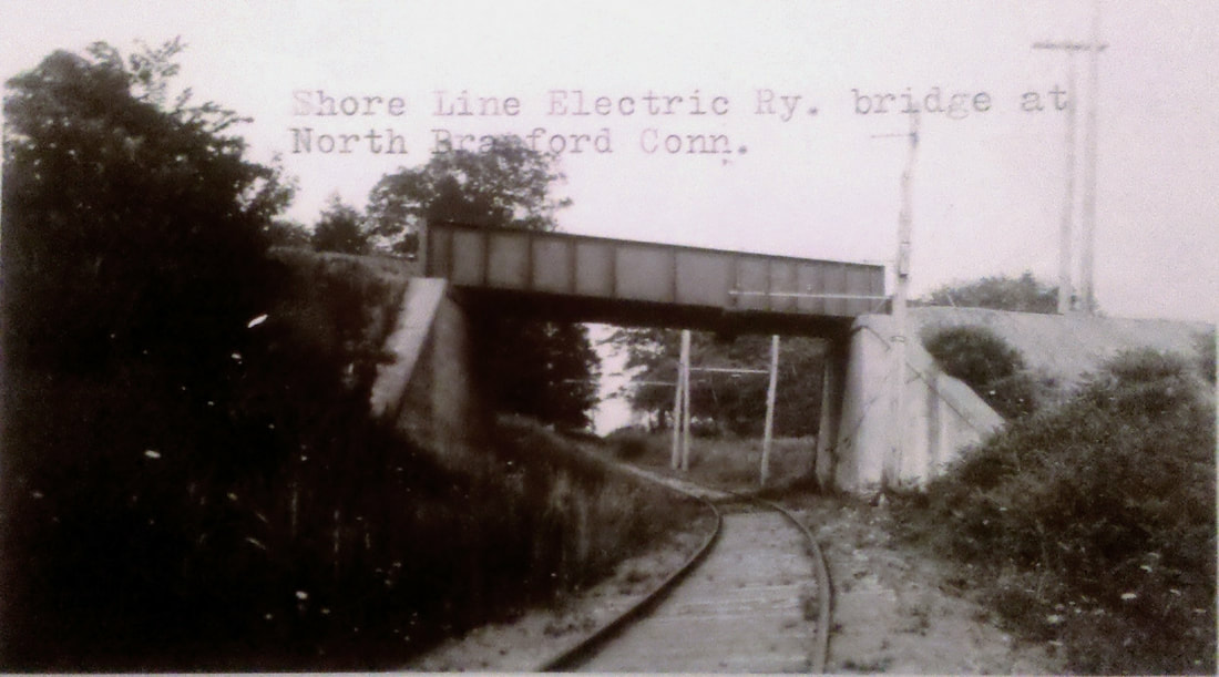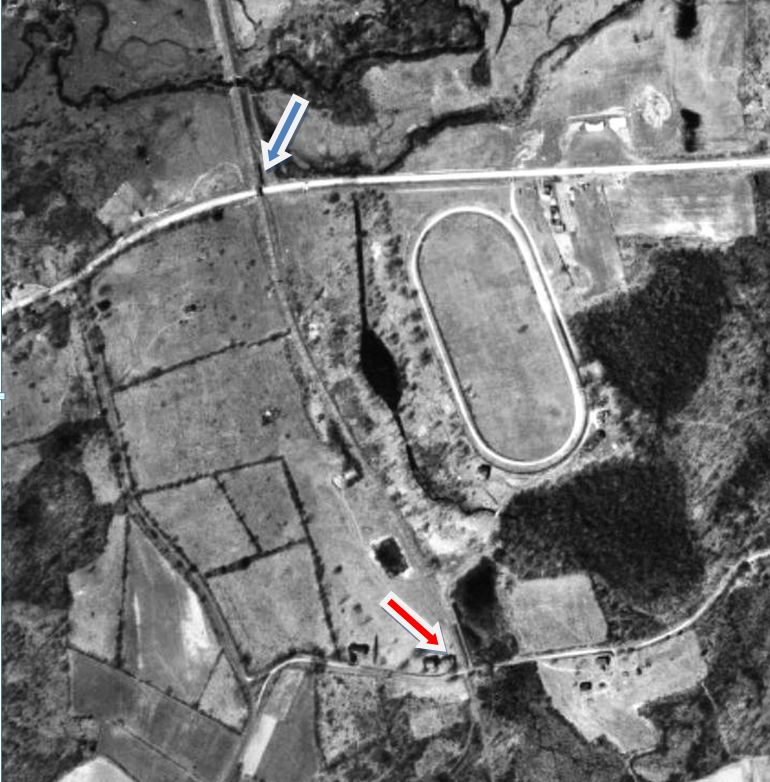 It is perhaps a little-known fact that the Branford Steam RR began as a spur track to a horse-racing and agricultural fair venue. The Branford Park Association was chartered in 1895 and the property was subsequently purchased by manager Louis Agassiz Fisk in 1900. Through his agency Branford Park Special trains initially brought passengers from New Haven Union Station to either BRANFORD3 or PINE ORCHARD2 and they were conveyed from there on existing roads. At [1] is one of several rare photos rescued from an estate sale on behalf of the Branford Historical Society. It shows a two-coach NYNH&H train at the platform that served as the park station when steam service started late in 1904; lower tracks in the foreground must have served the freight needs of the park. Our red arrow on the map at [7] shows the wye where trains were turned. Another of these photos at [2] shows trotters on the track. The shot at [3] is a newspaper photo showing the grandstands ca. 1909. By 1905 the P.T. Barnum-like impressario was illuminating his park with arc lamps, search lights, and mirror reflectors and promising a day and night "hippodrome" of trotting meets, bicycle racing, auto heats, vaudeville shows and airship fly-overs. Additionally the irrepressible Fisk was Branford's first selectman, state representative and had interests in Bridgeport and Waterbury racing venues; the L.A. Fisk Hose Company commemorates his name today in firefighting for the town. The 1934 aerial map at [4] shows the race track still very much intact. The red arrow points to Driving Park Rd., today's Gould Lane, seen in the 11/8/1923 PUC inspection photo at [5]. The blue arrow points to the railroad bridge over the Boston Post Road. Racing ended around 1912 but the annual Branford Fair continued at this venue. The final newspaper reference we see is at [6] in 1940 when Ben Kennard was running the property as the Pine Orchard Riding Academy. [REFS: Below][rev051019]