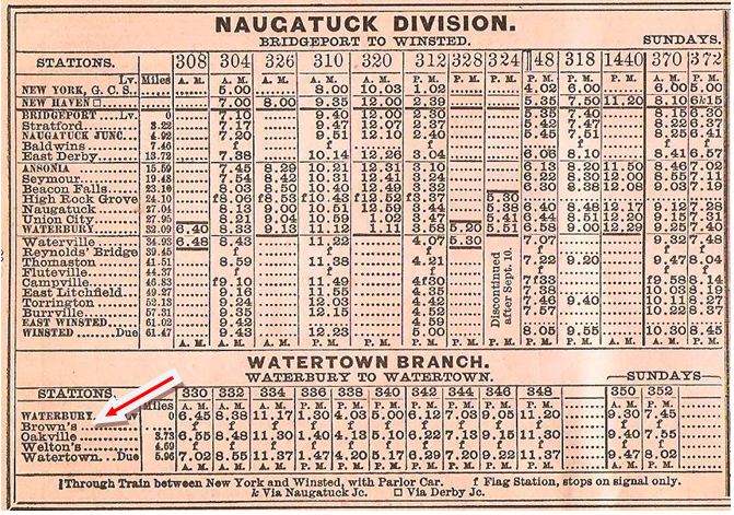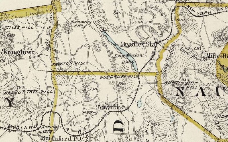 According to Rockey, this flag stop was established when the NY&NE opened through the town of Middlebury in 1881. Almost the first we hear of it is the 3/13/1884 letter at [1] sent by Charles P. Clark, then receiver for the already financially troubled NY&NE and later president of the triumphant NYNH&H, requesting permission to abandon this station. Though not important enough to merit official mention in 1881, BRADLEYS was in use long enough by 1884 and was sufficiently popular that public protest convinced the railroad commissioners to reject the request to eliminate it. A petition to the commissioners also requested that "... there be a Building to comfortably shelter People wishing to use said trains" here where apparently there had been no structure prior. By the time the 1886 real estate map at [2] was issued, a rectangular depot of perhaps 10x20 feet is seen with platform. The 1888TT at [3] is the only one we have seen so far that lists this stop. The location of the depot was just east of the South St undergrade bridge, as shown on the real estate map snippets we have pieced together. The 1893 map at [4] errs in showing the station just west of the highway on impossibly high terrain; the ROW was originally on trestle and later filled. The eastern bridge abutment still stands today and created a beautiful autumn scene at [5] on 10/18/2010. The newspaper reported a head-on collision of two freight trains at BRADLEYS on 3/12/1899, the aftermath seen at [6]. This was just prior to the permission to eliminate this stop by a special legislative act which also allowed the NYNH&H to discontinue UNION CITY/W in favor of a new station at OSBORNTOWN, subsequently renamed ALLERTON FARMS. Obscure flag stops, not always seen on timetables, were nonetheless protected by law if in use more than a year, requiring a hearing and permission by the commissioners for abandonment. The elimination of a station by the legislature is something we have not seen anywhere else and perhaps was due to the fact that two stations were being discontinued in favor of one at a completely new location. We have no photo and do not know the fate of whatever structure stood here. That it was not an agency station is proven by the lack of a role in the aforementioned collision in 1899 which took place just to the west between BRADLEYS and TOWANTIC. Our Track 11 Google Earth map at [7] pinpoints the location on South St. [REFS: RRC26.468 (5/15/1884); CRC32.1885.21; CWN/03/16/1899/03; HC/03/13/1899/01; NYT/03/13/1899/08; Conn. Spec. Law 405 (6/13/1899); R2.760][rev030818]