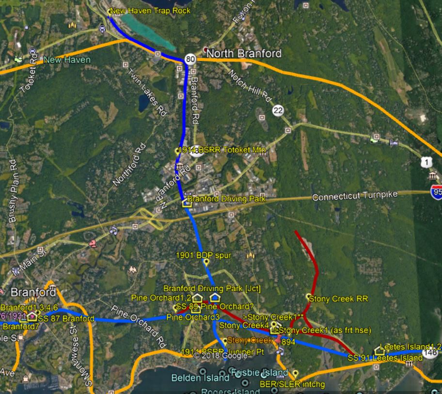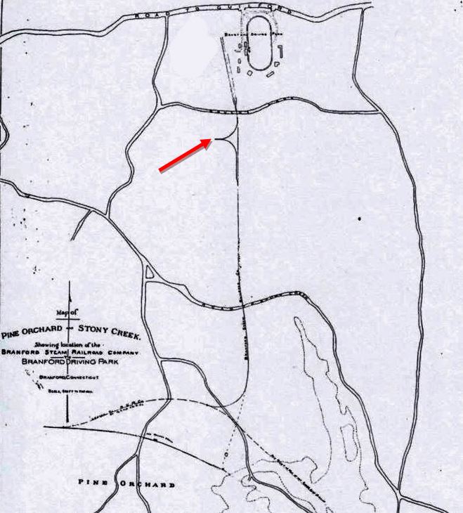 The irrepressible Mr. Fisk, however, wanted direct train service to the park and work on a stage road north to the park from the old NH&NL line was begun on 7/10/1900 and completed by 8/16/1900. We see the first mention of the BRANFORD DRIVING PARK station on 8/10/1900 when the paper reported that "special trains will stop at the new station at Pine Orchard and 'buses will convey passengers" from there. Other later articles describe the depot as "a trim little station just beyond Pine Orchard," and having platforms. Passengers from Saybrook could also access this station, the implication being that the entire trackage from STONY CREEK to PINE ORCHARD, abandoned as main line with the 1892 Shore Line realignment, was still retained for quarry service. Fisk would later purchase all of the cut-off for his purposes. Cooperating with him to get passenger use out of this trackage put money into the pockets of both the NYNH&H and his box office. Sorting through discrepancies in the reporting, it seems that tracks on the stage road were completed on 5/4/1901 and on 7/3/1901 "patrons found a string of horse cars" waiting to take them north on the BDP railroad spur. The cars were described as "very neat and pretty and lettered for "Branford Driving Park" [Oh, that we could find a photo of them!]. The Branford Steam RR was incorporated on 3/19/1903 by Fisk and two partners to take over the spur and permission to haul "property and passengers" by steam. The BSRR name was chosen to differentiate it from the Branford Electric Rwy that had opened on 9/3/1900. Since the spur was to be utilized only for park events, locally controversial grade crossings were allowed at a time when railroads were being required to eliminate them elsewhere. A connection with the park spur was made with the NYNH&H in 1904 and trains from as far as New York and Boston started running directly to the park. We have no photo of this station and do not know its the fate when passenger service likely ceased with the end of racing ca. 1912. The 1915 val map at [1] shows the western part of the old NH&NL ROW still in place to access the BSRR spur. The historical photos at [2] and [3] presumably are northward shots showing the ROW going up from the junction. The snippet at [4] is from our Track 11 Google Earth map and shows all the locations. The newspaper ad at [5] is from the New Haven Journal Courier of 9/1/1900. [REFS: NHER/04/01/1895/01; NHER/08/04/1899/08; NHER/08/31/1899/02; NHER/05/25/1900/09; HC/05/26/1900/02; NHER/05/30/1900/15; NHER/07/10/1900/08; NHER/07/21/1900/09; HC/07/26/1900/02; NHER/07/24/1900/02; NHER/07/26/1900/05; NYT/07/26/1900/05; NHER/08/10/1900/10; NHJC/08/14/1900/09; NHER/08/17/1900/10; NHER/08/31/1900/02: says track done and all-rail service to begin next Monday, without change of cars??; BOP/03/30/1901/06; NHER/09/04/1900/08; NHER/09/12/1900/09; CRC48.1900. 22; NHJC/05/08/1901/07; NHJC/06/29/1901/10; NHJC/07/04/1901/04; HC/09/04/1901/09; NHJC/09/11/1901/03; HC/12/28/1901/05; NHJC/12/30/1901/06: side track for switching at BDP jct; RRC37.485 (12/31/1901); NHER/04/29/1902/00; BOP/05/24/1902/06: nine extra horse cars; HC/12/31/1902/04; HC/01/23/1903/13; Spec. Law 1903-31; HC/12/28/1904/02; BRE/07/05/1928/01; HC/08/04/1933/07; HC/07/25/1937/D7; HC/07/13/1940 /SM13][rev121816, 122918, 050619]