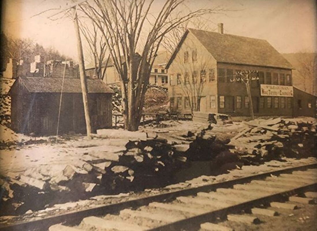 This was the Canal line station on the branch that was extended to PINE MEADOW in 1870 and NEW HARTFORD in 1876. The valuation shot at [1] is dated 9/27/1916. The image at [2] is Lewis H. Benton's #2467, taken in 1930, likely in June. It is a fabulous, well-composed shot showing a myriad of delicious detail. Irving Drake, fellow photographer and chauffeur, is at left, the 'restauranteur' may be the station agent; the gentleman on the right is unidentified. The 'M' and the 'D' on the crossarm of the telegraph pole signify dispatching and messaging circuits. Various lettered signs say 'Stop Here for Ice Cream, Soda, Candy, Cigars. Sauerkraut. Frankfurters. All Hots! Period ads for Coca Cola, Lucky Strike cigarettes round out the visuals but every item in view behind the depot is intriguing and telling; feel free to email us with more that you see. The freight building stands beyond the depot. A second-story window may indicate that the station agent lived upstairs in the depot. Peeking out above the station roofline is the W.R. Hartigan wood turning factory, a family-run business from 1869 that is still operating today. The photo at [3] shows the mill and wood logs delivered by rail. Canal line passenger service ended on 12/31/1925 but the running of trains on the CNE via Plainville and up the New Hartford Branch to Pine Meadow through 1927 extended life here as a commuter stop. Gas rail cars were used at the end. Fire likely struck the depot in 1936 or 1937. The newspaper said on 3/4/1937 "Old Depot Gone... The removal of the Burlington passenger depot marks the passing of one of the old landmarks. The old fire-gutted freight house still stands." Freight service lasted into the 1960s; track abandonment from Farmington to Collinsville was in 1968. [REFS: FVH/03/04/1937/03; D116+][rev081919]