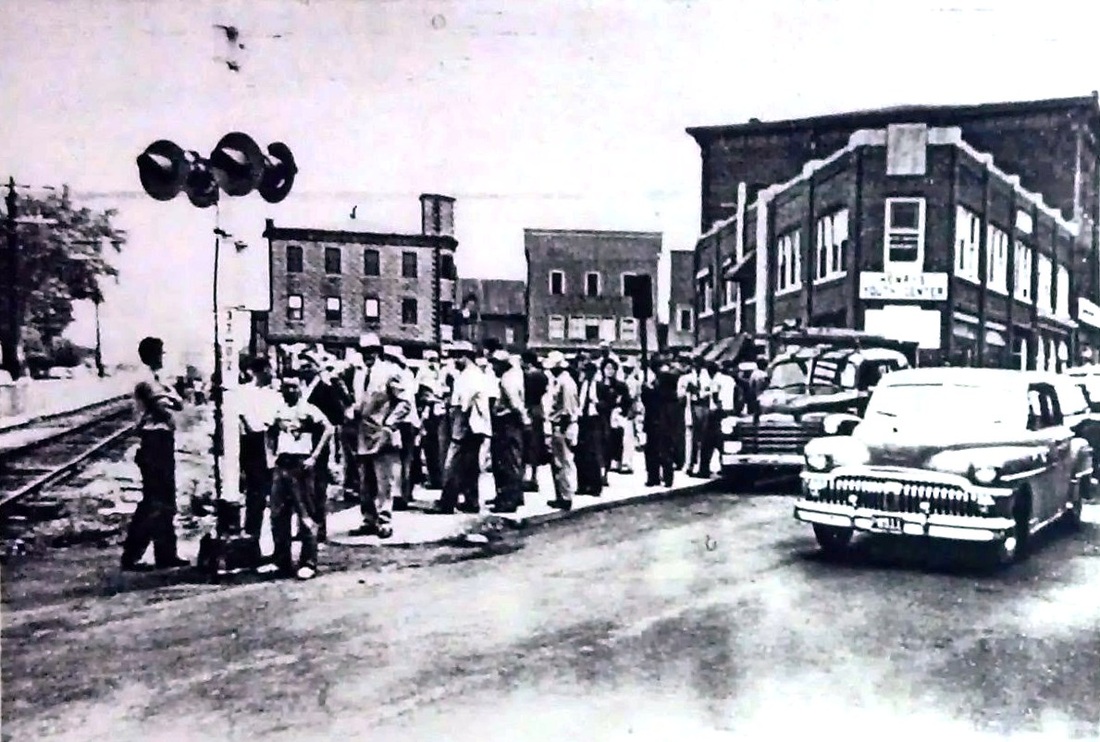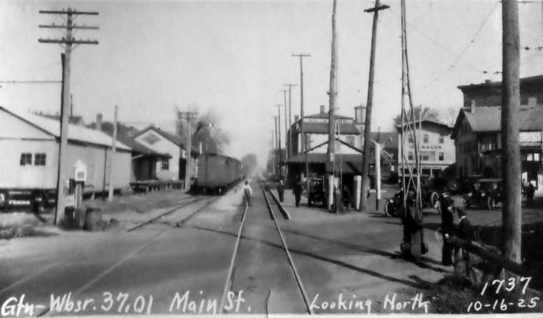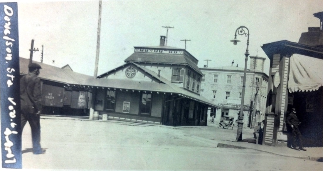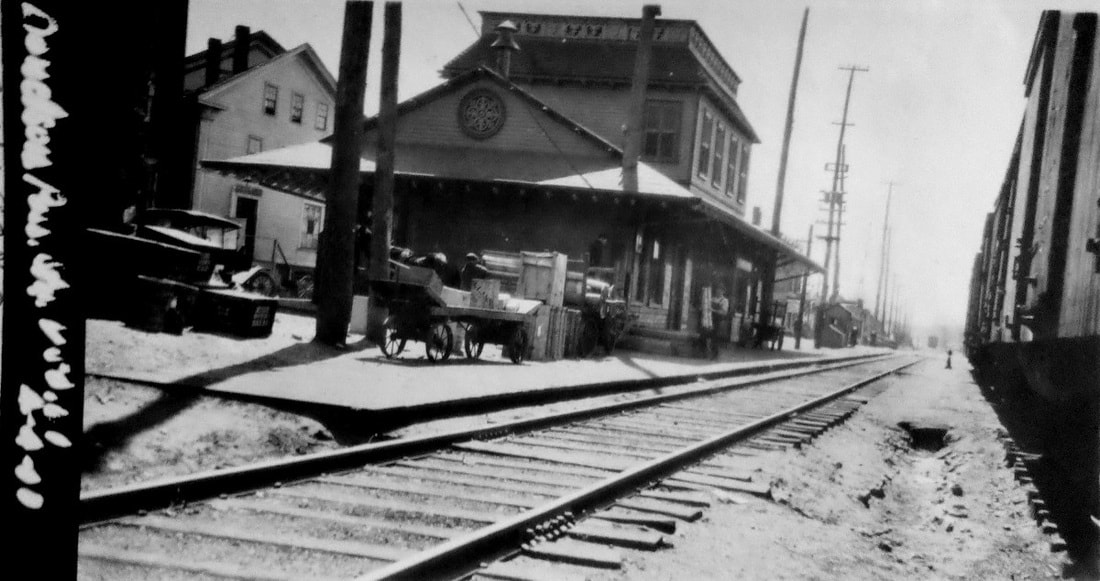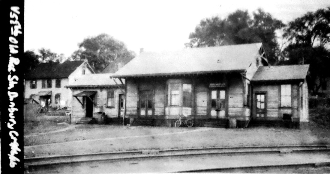 After the 3/9/1876 fire that took the previous station, the N&W built a new depot here that the railroad commissioners report was nearly complete in January, 1877. The NY&NE was leasing the N&W at the time and apparently did not feel as though it was their responsibility and thus provided no assistance and, according to Farnham, that position was later upheld in court. In the meantime, however, a letter to Railroad Commissioner Henry Hammond complained in August, 1876 of the absence of a passenger station that town officials said they were entitled to have had three months ago. The shot at [1] is from the 1900s and shows the new station, with its distinctive second-story dormer, standing like its predecessor on the east side of the tracks. The rather distinctive "wedding cake" architecture has yet to be explained to us, as do the porthole windows (stained glass?) in the north and south eaves. The snippet at [2] is from the Bailey map of 1913. The Providence & Danielson street railway line to the right of our arrow is also seen. The railroad station itself seems to be larger with an additional baggage room on the south end. The val photos at [3] and [4] are dated 4/4/1917 and look north and south respectively. The northward PUC shot at [5] was taken on 10/14/1923; if you look at the extreme lower right, you can see the trolley track. We do not yet know when and under what circumstances DANIELSON3 met its fate; 'Doodlebug' passenger service was eliminated on the N&W line in 1928. The historical society has just shared a photo of the depot in the winter of 1933, perhaps the last image we have of this station. The shot at [7] shows it was no longer standing on 6/9/1952 behind the "Budd Car Reception Committee" when service was resumed by the NYNH&H. The stop did not make it into Amtrak in May, 1971 when the new corporate entity declined to include the N&W in its system. [REFS: RRL: 8/2/1876; CRC24.1877.26; B389; K108; Q145] [rev020519]