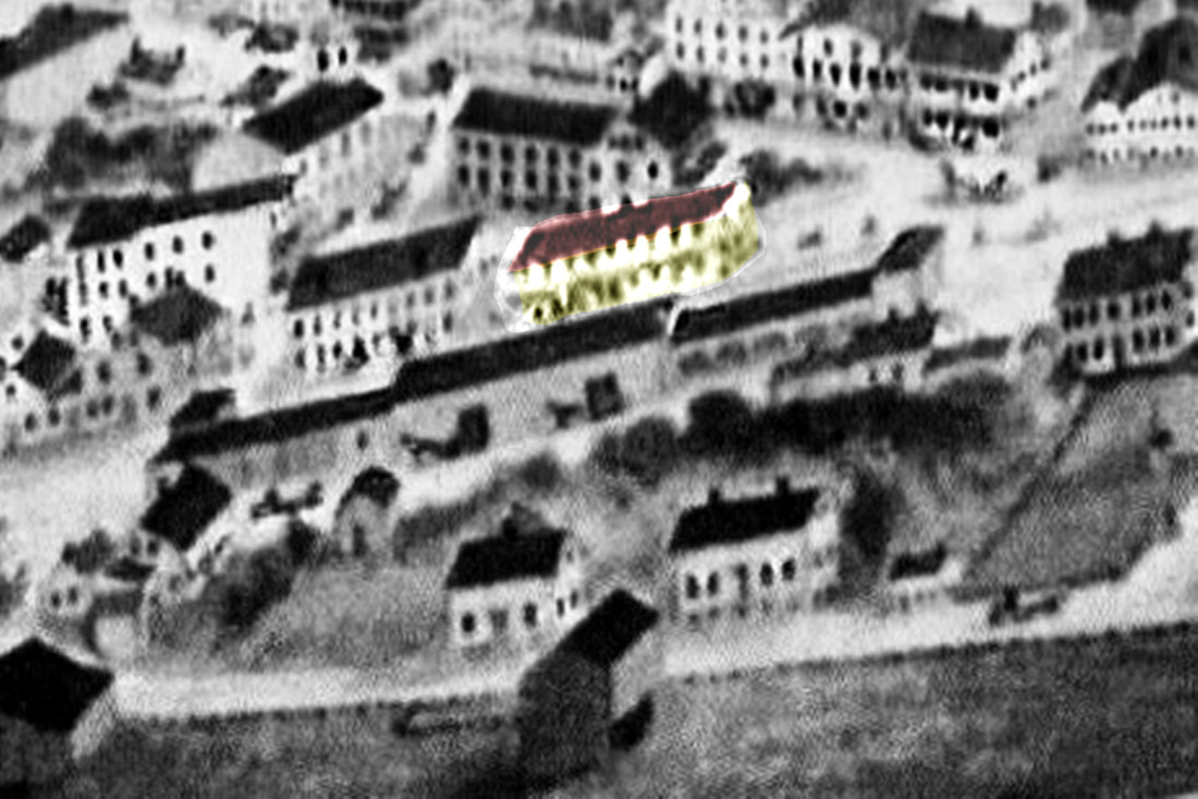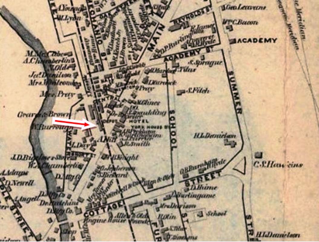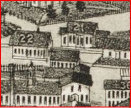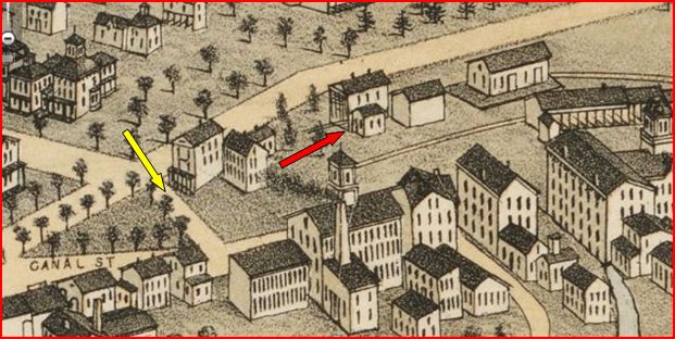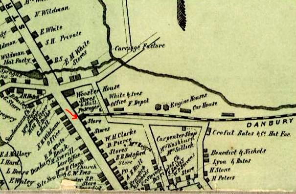 This depot is a bit of an enigma. No photos have been found. The snippet on the left is from the 1883 Bailey bird's-eye map and the smaller structure in front of DANBURY3 and DANBURY4 [locator nos. 21 and 22] may be the elusive station, though it appears larger than we thought. The representation on the 1875 map at the right may be better and may show the NYH&N station, a much smaller structure than the other, at the red arrow. It would be later moved to where the yellow arrow points. [rev112815]