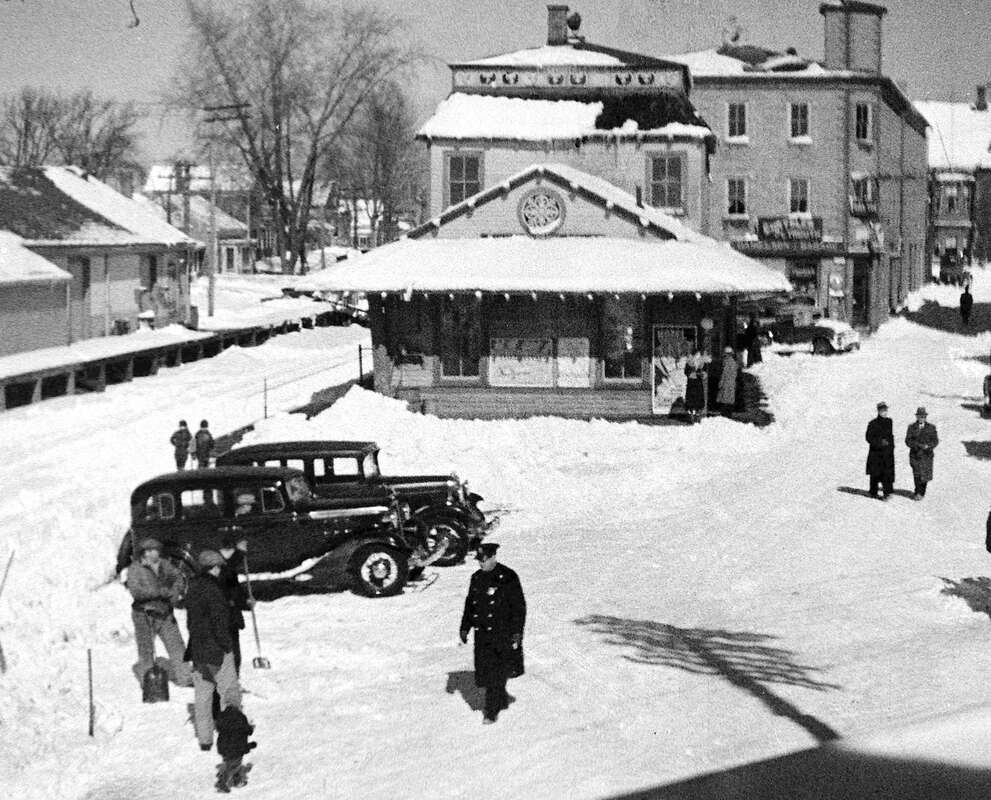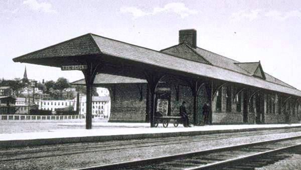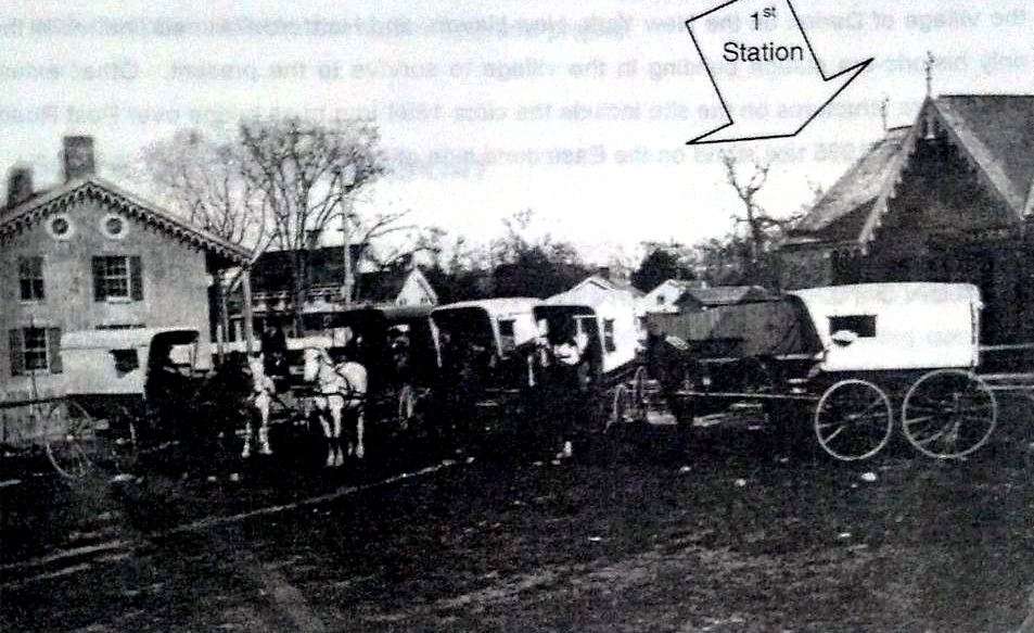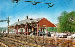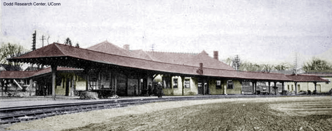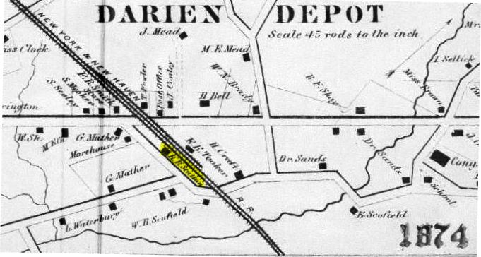 The stop was established in 1848 by the NY&NH. The first depot here, seen in the photo at left [add070113] was a cross-gabled Gothic structure like GREENWICH1, MILFORD1 and virtually all the other original stations on the line. The location, on the eastbound side of the line that was double-tracked in 1859, is seen on the 1874 map. [REFS: R46 says 1885 fire took saltbox depot(?)][rev070113]