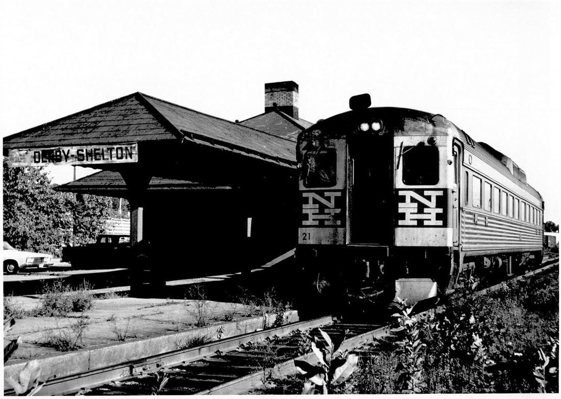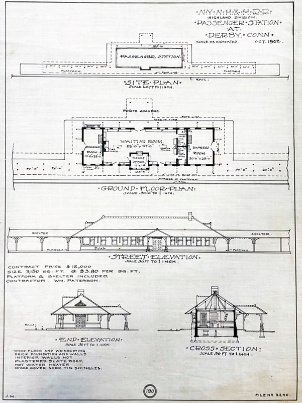 This station opened on 10/18/1903 to replace DERBY2. The architectural drawing at [4] is dated 10/1902 for this station that had been long in the planning. The circled '190' at bottom center makes it look like this came from a book of architectural plans in the railroad's real estate office. The view at [1] looks pretty clean and was possibly taken right around the 1903 opening. The ICC valuation photo at [2] is dated 11/10/1916. Tom Nelligan took the photo at [3] of RDC-1, #21, on 9/3/1967. See Track 4C, MP 4.63.3+ for much more. [REFS: CRC51.1903.20][rev111918, 101320, 040123]