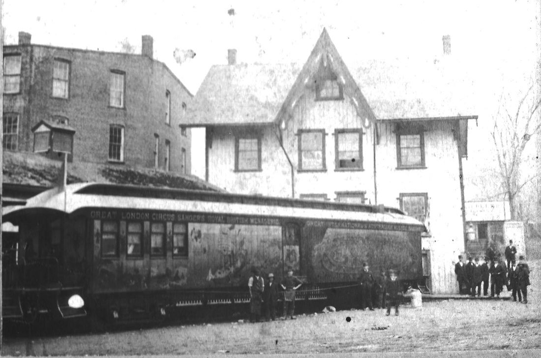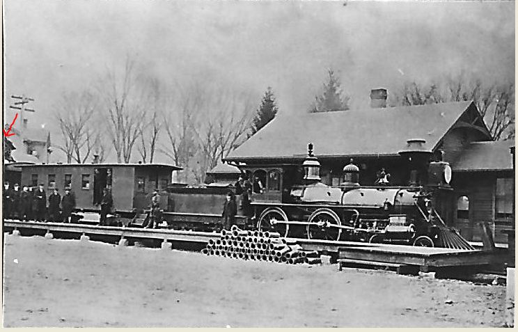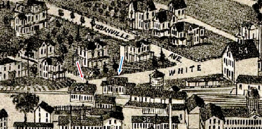 This station took the place of DANBURY2 which had been inherited from the NYH&N at its White St. terminus and characterized by the railroad commissioners as "old and inconvenient" in their 1883 annual report. As seen here at left, it is BROOKFIELD JUNCTION2 after the HRR moved it there in 1889. See B stations and Track 10, MP 10.4.6 for more. No photos have been yet found of this station in its original location, though the shot at middle of DANBURY3, which sat across the track, shows the corner of the DANBURY4 in the extreme left. The Burleigh bird's-eye map of 1884 shows DANBURY4 at the red arrow and DANBURY3 at the blue arrow. [REFS: CRC30.1883.19][rev112815]
