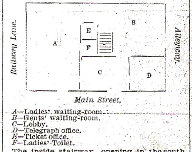 This station stood where the post office is today at 265 Main St., with the rear end of the property reaching all the way to Ives St. The location is shown on the 1856FC map. See Track 10, MP 10.1.3 for more. The railroad commissioners reported in 1884 that the station had been remodeled and improved and it served until 1903 when DANBURY5 opened. The floor plan at lower left shows what the new arrangement was to look like with a new separate waiting room for ladies made possible by moving the Adams Express office elsewhere on the station property. DANBURY1 was razed in 1914: see Track 10, MP 10.7.1. [REFS: DN/03/28/1883/??; CRC31.1884.14][rev060418]