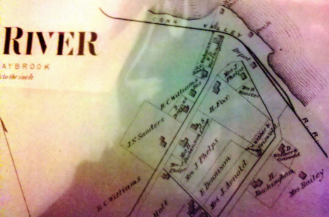 The map is from the 1874 Middlesex County atlas, when this village was within the township of Saybrook, not to be confused with Old Saybrook to the south; Deep River would become an independent town in 1947. This classic CV passenger station was up for the opening of the CV in 1871, a replacement planned in 1905 was never built. The 1938 SSRR list says this station has been sold. Max Miller says it was razed in January, 1939. The 1890 freight house here still stands in 2018. [REFS: R47; HDC/08/25/1871/02; HC/08/17/1905/12; ATVL, p35][rev011218]