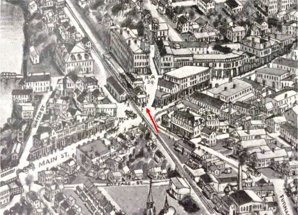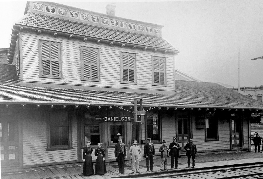 This station in the town of Killingly was first called DANIELSONVILLE and also known as West Killingly for which the post office was later named. The stop was established by the N&W in 1840 and we have a reference to a depot structure as early as a 1/15/1840 article in the Norwich Chronicle. The image at [1] is from the 1864 Albert Conant bird's-eye view of the borough from the west and actually shows both DANIELSON1 and DANIELSON2. As H.V. Arnold explains the buildings seen in this rendering, the first passenger station stood on the west side of the track and "two long sheds projected from either end of the depot and terminated in square-built towers which housed the water tanks. The sheds were for storing wood... for there were no coal-burning engines on the road until 1861... The railroad buildings were clapboarded and painted a brown color." Al Weaver has colorized the station for clarity; the passenger station built in 1839-1840, is in the center. The location is seen on the 1856WC map at [2]. The 1851 timetable at [3] shows DANIELSON to be almost exactly half way between ALLYNS POINT and WORCESTER. An ideal place for water and wood refueling, the boat train made this its sole stop on the express run between the two termini. This station became the freight depot in 1860 when DANIELSON2 debuted. [REFS: NC/01/15/1840/00; HDC/08/07/1854/02; Q145; Henry Vernon Arnold, Bird's-eye View of Danielson Borough: An Explanation... (1926), p14][rev020519]