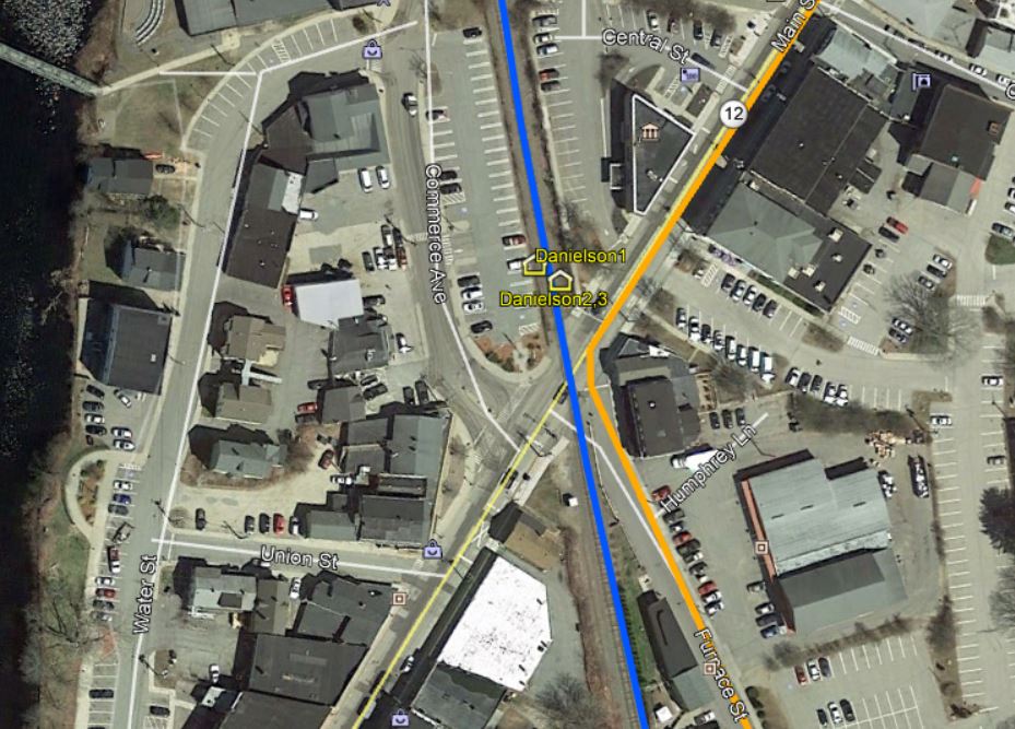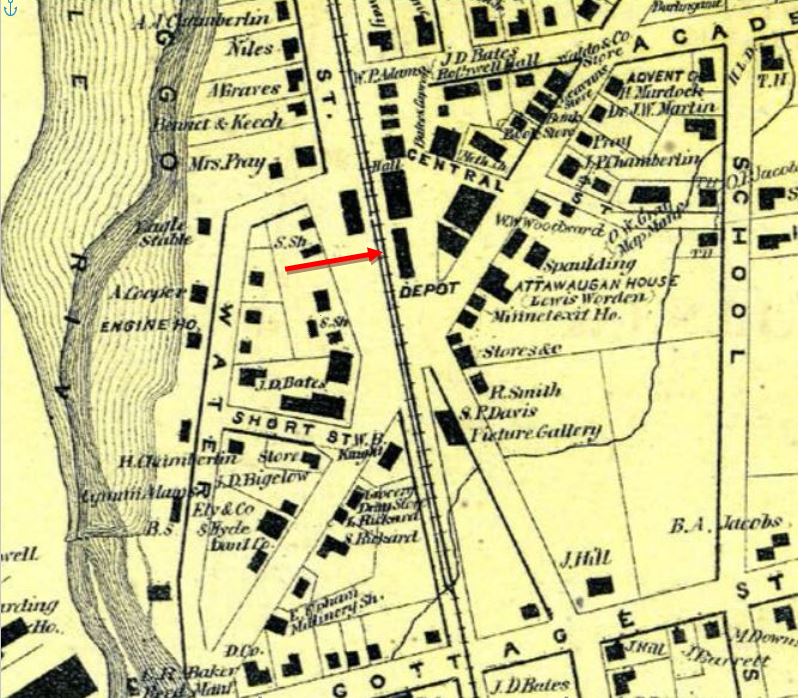 Again according to Arnold, Sylvanus Gleason became station agent in 1858 and was instrumental in making changes to the station grounds and structures, so in 1860... "a substantial two-story depot was erected where the removed freight house [slightly to the north?] had stood. It was not clapboarded, but sheathed outside with flooring material painted a drab color and sanded over. Below the upper story windows a porch roof protected the platforms on the track side and the south end." Al WEaver's colorization makes these details quite clear in the image at [1]. The structure, now on the east side of the tracks, has the covershed on the west and south sides just as Arnold describes. The 1869 map at [2] verifies the relocation of the passenger depot. Arnold claims this depot burned in June, 1876 but the newspapers say it was at midnight on 3/9/1876 when all the adjacent railroad structures went up in flames. Gleason himself, then retired and "living in Washington [RI?]" was said to own the depot buildings and to have suffered a loss of $20,000. This apparently is another interesting example of private ownership of structures that railroads used by gift or lease, in many cases reverting back to the original owner when train service ended, e.g. ORANGE on the NH&D. The snippet from our Track 11 Google Earth map shows the active rail today in blue and the former trolley line, which ran from 1902 to 1920, in orange. [REFS: BT/03/09/1876/02; NA/03/10/1876/02; CRC24.1877.26; Arnold, p14-16][rev012819]