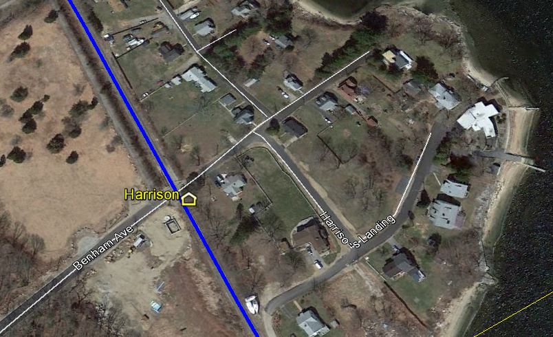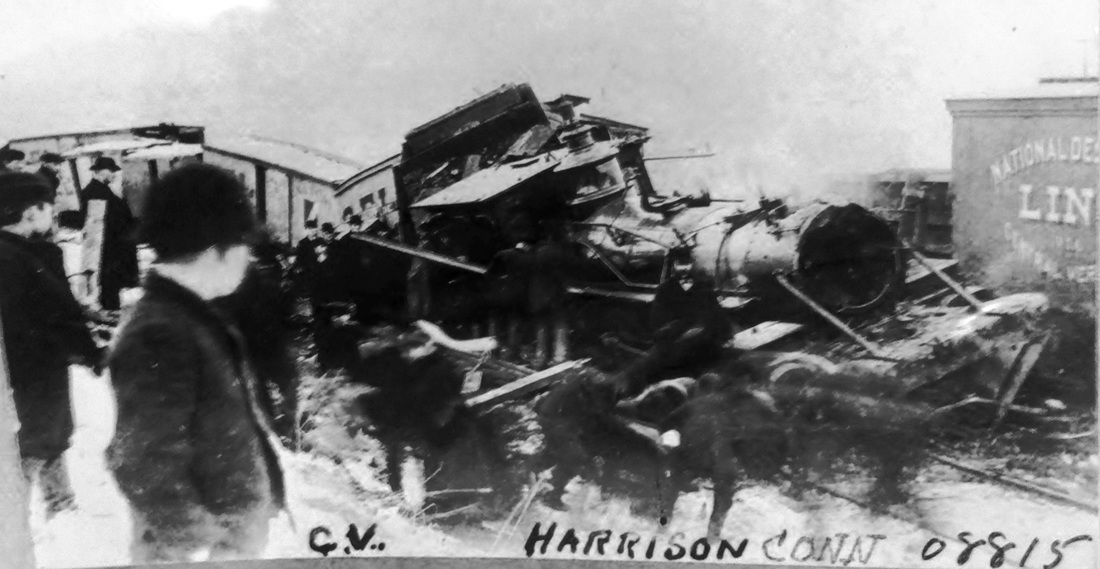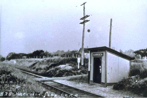 The first reference to this station in the town of WATERFORD is a Courant article in late 1882 and it appears on the RRMs from 1881 to 1912, though it escaped inclusion on the 1883 NLN atlas. A 1900 CVT timetable and the RAM maps show it as being two miles above New London. Image [1] gives us a look at the side and back benches inside this spartan accommodation that stood in the southeast quadrant of the grade crossing. Image [2] shows the outline from the 1934 aerial map and [3] pinpoints it on our Track 11 map. Shot [4] is a 10/9/1923 PUC photo and [5] is a 1930s Lewis H. Benton image that captures 'chauffeur' Irving N. Drake peeking out. Trains were signalled to stop by raising the red ball that is seen over the shelter. This location saw its share of excitement during the famed collegiate rowing competitions on the Thames River. Those meets for a time included teams other than the top-billed Yale and Harvard race; the Cornell team was actually headquartered here at Harrison's Landing, seen at the foot of Benham St. on the present-day map [3]. Sometimes referred to as MAMACOKE for the adjacent cove, this was the southern end of the four mile course that began at BARTLETTS. This station was in the news in 1892 for a fatal, head-on collision of two trains about 1,000 feet south of HARRISON. The NLN's Norwich operator, Thomas K. Carroll, 20 years of age and serving both as telegrapher and switchman on 11-hour shifts for $1.50 per night, was blamed for being asleep and missing the passage of the southbound train. The railroad was censured both for overburdening the operator and for positioning a car carrying four valuable horses and their attendants, en route to the races at Poquonnock, immediately behind the engine. All were killed in the crash which may be pictured in image [6]. Passenger service on this CVT line ended in 1947 and how long this station was in use is unclear. ETT #5 (4//26/1936) at [7] left still shows it as a flag stop at that time but an 11/4/1944 schedule shows all the flag stops eliminated at least by then. [REFS: NLDC/0713/1857/02; HDC/11/15/1882/04; NHER/09/13/1883/01; NHER/10/14/1892/01; NHER/10/21/1892/04; NYH/10/15/1892/10; NYHT/10/15/ 1892/01; NYT/10/21/1892/03; K101][rev020914]