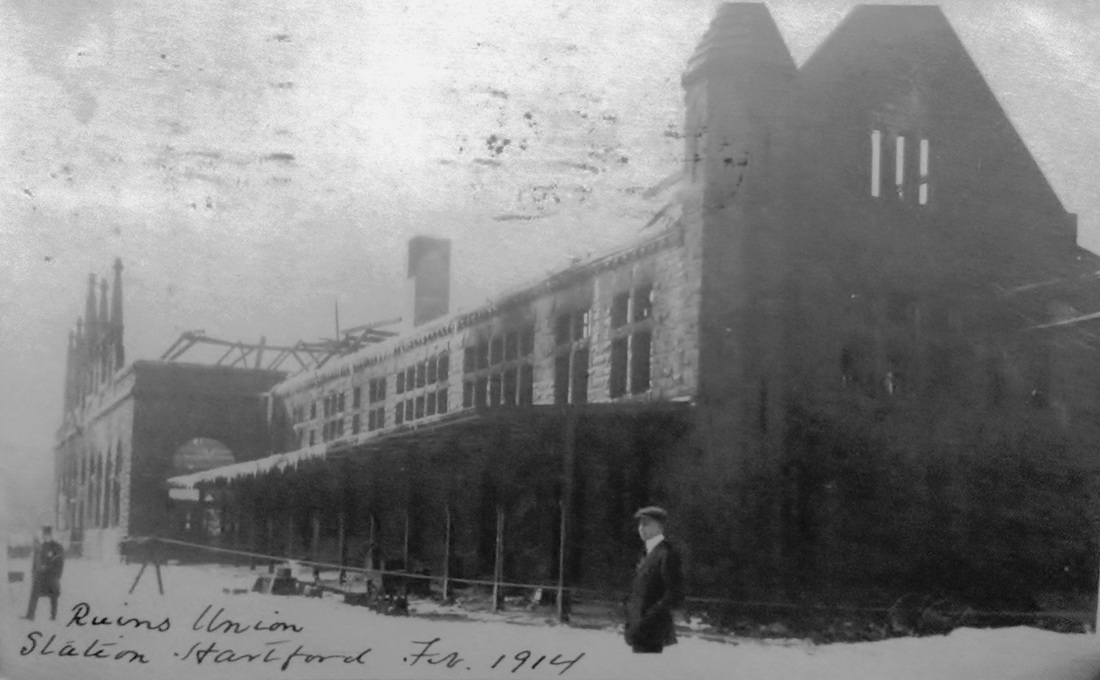 A fire on 2/21/1914, caused by an overturned oil stove in the Adams Express Co. office, necessitated an expensive and extensive rebuild for HARTFORD8. Three fire photos are seen on the top row in the lower group; 1907 date is in error. A temporary station, HARTFORD11 [see below] was begun immediately on the Spruce St. (west) side of the damaged station to be used by southbound passengers and opened on 2/24. The street-level restaurant, with only smoke and water damage, was to be used for northbound passengers while it was decided what to do after the fire. Disliked for its limitations and the “mazes of [the] ancient structure" that were said to be a "labyrinth to the uninitiated,” the station was never a popular building. A group from Hartford visited President Mellen to discuss plans for reconstructing it in a better manner and perhaps choosing a new location entirely. Mellen reportedly said that in his opinion the “Hartford railroad station was the worst abortion on the road between New York and Boston” but, in spite of this sentiment, the NYNH&H decided to rebuild using the walls of the old structure, which were deemed sound. Interestingly, the newspapers mentioned the need for the old station plans, said to have been imported from Hanover, Germany ca. 1880, to be found down in New Haven to see what had to be changed to meet the current Hartford building code. Apparently this was done and the station was rebuilt, with the former cross-gabled roof replaced by a flat, steel fireproof covering instead, noticeable in the photo at bottom left, with an image of the burned-out structure just above it. Though the station reopened officially on 9/27/1915, it should be noted that all train service continued in the interim, even using the tracks on the eastbound side immediately after the fire was put out. The paper noted that the Valley, Connecticut Western (CNE) and Connecticut Central trains were still terminating here at Union Station, by now all as branches of the NYNH&H. The card at [4] looks north and the image at [5] shows the interior. The shot as [6] looks east at the covered walkways up to the elevated station. Comparing the rebirth to the of the phoenix rising in Classical mythology, the Courant said it was pleased with the changes and invited New Haven people up to see the new station here and compare it to their old "antique," NEW HAVEN4, that would not be replaced until 1920. The teasing sentiment showed that the rivalry between the old capital cities that dated back to the 1700s was still in vogue over two centuries later. [REFS: HDC/04/18/1887/03; HDC/05/02/1889/08; CRC38.1890.52; HC/02/22/1914/01,10; HC/02/23/1914/02; HC/03/14/1914/04; HC/09/27/1915/05][rev090512, rrd051419, rev012723]