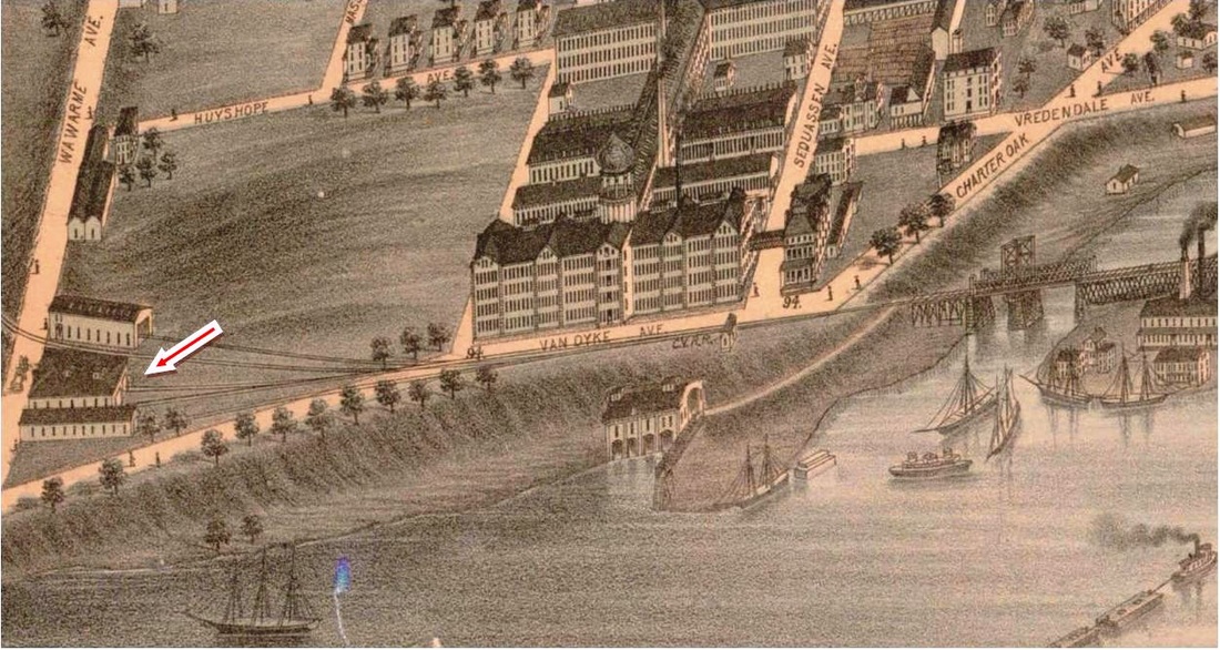 This was the temporary CV station, called COLTS or DYKE, which apparently stood in front of the firearms factory at first. It was removed afterward and is seen as the middle building at the red arrow in the complex to the far left. The depot was described as being 163x32 feet in size and having three tracks going inside. Once the State St. terminus was established farther north early in 1872, the intention was to relocate the COLTS structure to the south dyke area and to use it as a car house in what became the the CV's first operations base in Hartford at Wawarme and Van Dyke Aves. Even though COLTS was not a timetable stop in later days, special trains continued to depart from here, as in August, 1872 when a Fenwick-bound excursion did so. This location was a still a NYNH&H freight station at least until 1925 and the spur to Brainard Airport and the Hartford produce terminal, installed in 1919 [RCM], still leaves the former CV main here today. This and the next shot are from the O.H. Bailey 1877 bird's-eye map of Hartford. [REFS: HDC/08/01/1871/02; HDC/10/03/1871/02; HC/01/13/1872/02; HDC/08/28/1872/02][rev010314]