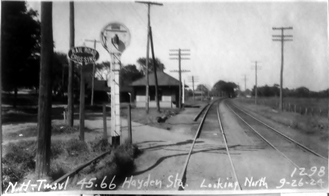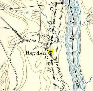 The 1855HC map indicates that this stop in the town of WINDSOR was at least here by that date; it probably does not go back to the opening of the Hartford-Springfield line in 1844. What shelter or platform first served here is not known but the the stop is mentioned in periodicals back to 1858. It does not appear on timetables or lists that we have seen before 1880. The eponymous Hayden surname derives from William Hayden who came to Windsor with the second wave of English colonists in 1639 and whose descendants populated the area around the station which was named for the family. [REFS: GED1858; BA23.1870.00 (4/2/1869); NYT/04/09/1871/01; HDC/04/10/1871/02; NA/07/09/1873/03; CRC22.1875.35; PTH380. 1871.17][rev072816]