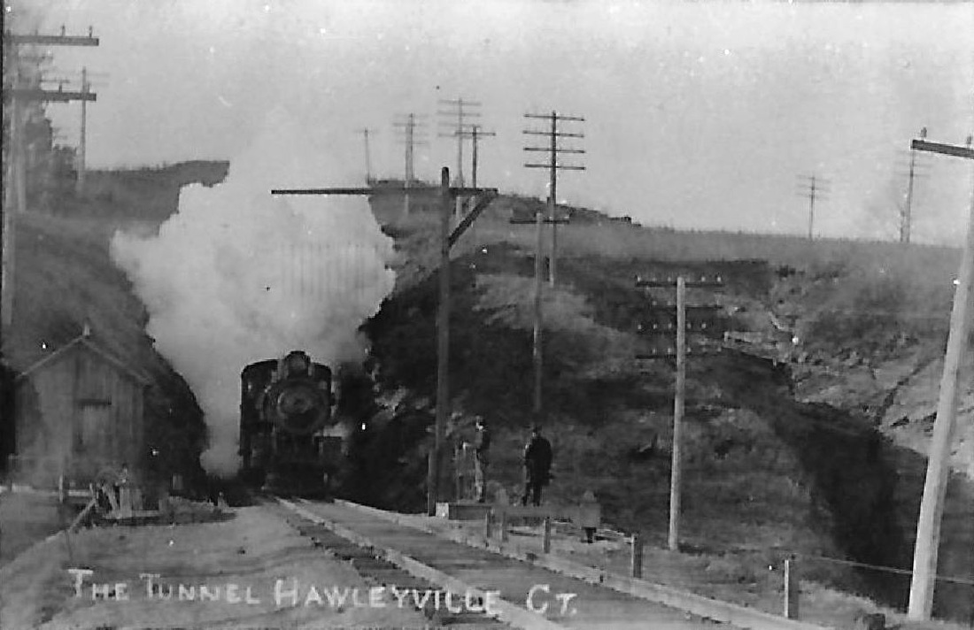The history of this railroad village is enhanced by the two tunnels that were built to reach it. The first was the 200-ft HRR bore, an impressive engineering feat in 1839 that received scant mention in the newspapers of the day. This first tunnel was joined by another when the BH&E drilled through the mountain in 1870, as reported in the Courant which said the new tunnel was cut wide enough for a double track, was twice the length of the HRR's and 27 feet lower than the old one. Unused for a decade, it was in the news in 1880 again as the NY&NE was completing the BH&E's dream of reaching the Hudson River, the Courant then reporting the dimensions to be 380 feet in length, 26 feet in width and 20 feet in height. The 1892 topo map at [1] shows the 1881 NY&NE line paralleling the 1840 HRR (unlabeled). Contrary to claims elsewhere, there was no shared track from Hawleyville at our red arrow to the tunnels at our blue arrow -- these were two, independent, competing lines. The ca. 1908 shot at [2] shows a Bridgeport-bound train emerging from the east portal of the HRR tunnel; the NY&NE's is out of sight in the ravine to the right with its telegraph line surmounting the rocks. The photo at [3] essentially duplicates the view at [3], but looking west through the HRR tunnel. The old tunnel was abandoned in 1911 upon the completion of the new, double-tracked Maybrook line which replaced the old ROWs. The NY&NE tunnel would be reinforced with concrete by the NYNH&H as part of the reconfiguration, as seen at [4], and it was in service until 1948 when the Hawleyville-Southbury portion of the NY&NE was abandoned. The 1963 image at [5] shows the Parmalee Hill Rd. and bridge effectively made into a triple crossing over the HRR tunnel barely seen at far right, the NY&NE tunnel far below, and the new Maybrook line which for which rock was cut away completely above the tunnels. The Maybrook line has been cut back to Track 2 in the 1950s and only ties remaining for Track 1. Both bores will be extant til the end of time. [REFS: SL32.1.36][rev071822]