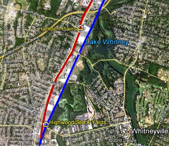 This stop was one mile west of the MW&CR's West Main St. station in MERIDEN. No stop is seen here upon the opening of the railroad in 1888 but it appears as HANOVER on a 1900 NYNH&H timetable, as HANOVER PARK in the 1907 ABC Pathfinder guide, and as indicated on Snow's map at [1]. The park facility itself was one of the many in the state that were created or subsequently operated by railroads and trolley companies to increase ridership and profits, especially on the less busy weekend days. This one was the property of the Meriden Street Rwy and it was later acquired by the Connecticut Co. A popular destination, it saw picnics and boating, baseball games and athletic events, and, in the 1930s, dance marathons. There was reportedly only a platform here, which is not seen either on the 1915 val map or on the 1918 Bailey aero view at [2]. Rail service ended on this line on 6/24/1917 though trolleys and buses continued to bring people to the park until the 1940s. The Connecticut Company map of the facilities at [3] is dated 8/26/1921 and signed by Construction Engineer Charles Rufus Harte. Harte was also a engineering and transportation historian who took a special interest in the Farmington Canal and captured many of the structures of his day on film. [REFS: HC/06/27/1896/03; Hill, 1.88; S14,29][rev032113, 110420]