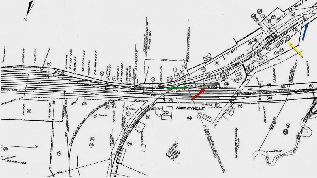 We think the small gabled structure at [1] is the 1872 Shepaug depot. The SRR opened for through service on 7/1/1872, including a six-mile link between here and Bethel that was built jointly with the D&N and operated by the latter company. Newspapers closest to home are the most reliable for local events and a key article from the Newtown Bee was reported on 7/6/1881 in the Danbury News. It says: "The old Shepaug building has been moved upon its new pins, where it will be freshened up for a baggage and freight room. The foundations for the new part, which will be the depot proper and contain the waiting rooms, are already well along, and we shall have our depot, apparently, in time for the opening of the line, which is still an uncertain date though near at hand." The image at [1] is from a larger photo which shows baggage carts in front of HAWLEYVILLE2. The shot at [2] shows the full union station, HAWLEYVILLE3, at a later date. The 1931 photo at [3] shows the rear of the building where the D&N met the SRR and intersected with the HRR as well. This building, later the telegraph office, would stand until at least 1947 with the rest of the union station. [REFS: CC/01/13/1872/04; WH/06/07/1872/02; SR/08/18/1880/05; NBE/11/17/1880/03: tin roof contract given; DN/12/01/1880/04; NHER/03/14/1881/04; DN/07/06/1881/00; HDC/07/23/1881/02; DN/07/27/1881/01; P35,39][rev022015]