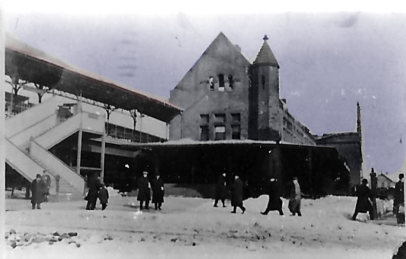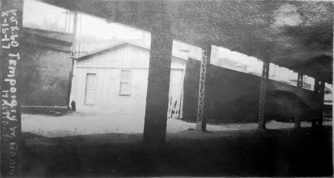 With its 1917 date and marked as 'Temporary W[estbound] room, Hartford', this must have been the structure used when HARTFORD8 was out of commission after the 2/21/1914 fire. Work started the day of the fire for the building that was put up on the Spruce St. side of the tracks and it was opened within two days of the conflagration. It is hard to imagine that this nondescript structure would still be standing in a busy downtown area two years after HARTFORD8 reopened on 9/27/1915, but the 8/16/1917 ICC valuation photo proves that it was. Perhaps, it served some freight or express purpose in the meantime. The image at right appeared in the newspaper when the temporary station was being put up. [REFS: HC/02/23/1914/01][rev051419, 012723]