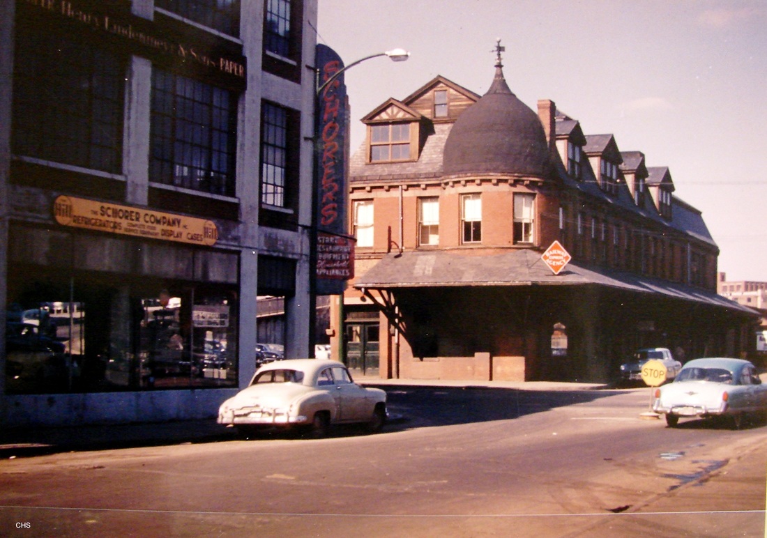 This station was in some ways the result of the elevated level of the new HARTFORD8 station. While there was still a track connection further to the north, HC&W access to Union Station was impractical, unnecessary and, with the landlord being the NYNH&H, expensive. The HC&W, therefore, decided to build a depot of its own at Spruce and Church Sts., northwest of the new Union Station. The $16,000 contract was let on 3/4/1889 and the station opened on the scheduled date of July 1, though still somewhat incomplete. The architect was Brooks W. Lincoln and the builder was H.W. Fox & Co. of Hartford. The handsome, two-story structure had space for the company's offices on the upper level. The building sported a Turkish-style minaret in the southeast corner and the gambrel roof was punctuated by dormers, altogether a uniquely stylish station and railroad headquarters. The H&CW's next annual meeting took place in the new station where the lease to the CNE&W was approved on 3/14/1890. References to a Walnut St. station, that street being on the northern and eastern boundary of the railroad's property, appear to mean this depot, though it was a good distance away from that street. Under the NYNH&H, this station was given over the Railway Express Agency use in the 1920s and continued in that capacity until 1961. A Courant newspaper article then said that REA service was being transferred to East Hartford's former NETCo facility, which coincidentally had no rail spur, truck pickups being made from the Morgan St. freight house. The old station surrendered to the wrecker's ball thereafter, since it "was in the path of the new East-West Highway" that we know today as I-84. The image at [1] shows CNE #8 on the street side of the station. The photo at [2] looks to be from the 1930s and the shot at [3] from the 1950s just prior to the razing. [REFS: HC/08/17/1888/05; HC/03/05/1889/05; NHER/03/06/1889/04; HC/07/01/1889/01; HWT/07/03/1889/08; NHER/12/14/1889/01; HC/03/15/1890/01; HC/08/31/1961/20A][rev110815, rrd051419, rev012723]
