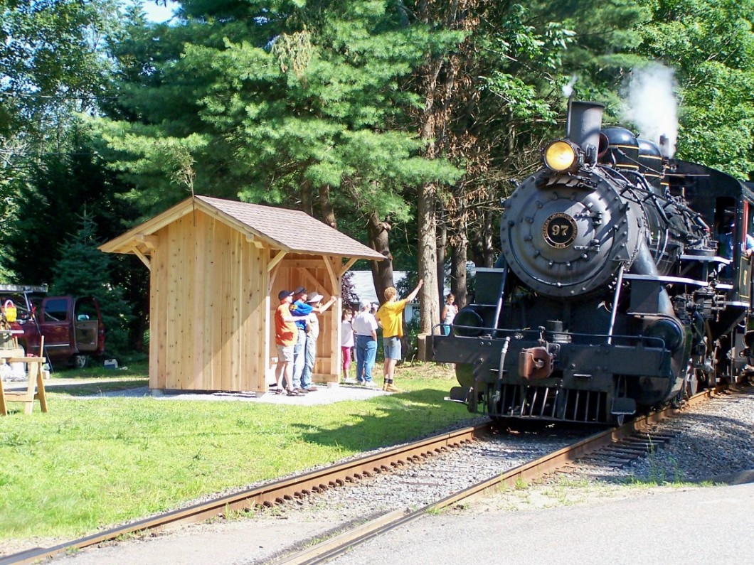 This structure, built by the Friends of the Valley Railroad, debuted on 7/18/2009. VRR passengers who use the flag stop here to catch the ferry to Gillette Castle now have some place to be shielded from the elements. The depot is a post and beam, mortise and tenon structure that uses no nails in the framing. It stands in the same spot as HADLYME2 and was modeled on SOUTH BRITAIN. The No. 97 is headed north in the shot to the right. Max Miller did the signboard with his usual precision. Thanks to Lee Carlson and the FVRR for the work, the photos, and the info, all of which make this railroad the great success it is today. [rev010318]