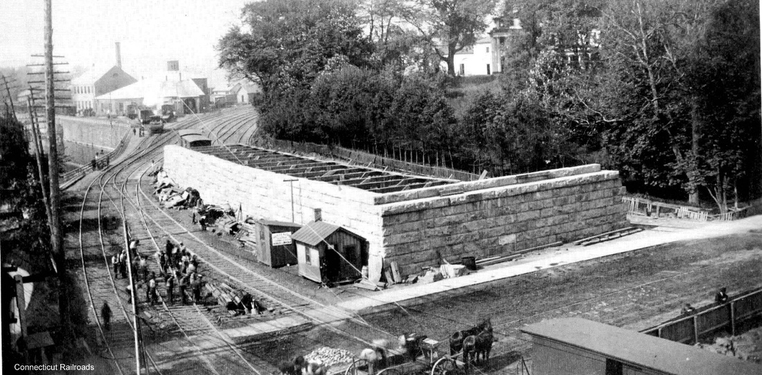 We did not even know there was a separate NY&NE temporary station while HARTFORD8 was being built until we found some articles in the Courant. So when we looked at this photo again and realized that there was nothing here at the red arrow before HARTFORD2 was torn down, it seemed likely that this is HARTFORD7, shared by the CW that came in from just where the curve swings off to the upper right in the distance. An article in May said "The temporary station in Spruce street for the use of the New England and Connecticut Western roads is being erected as rapidly as possible." A fire in the temporary depot in December, 1887 is noted in the paper which says repairs had been made. [REFS: HDC/05/26/1887/02; HDC/12/01/1887/08; BA42.1889.00: fire on 12/2/1887][rev123112, rrd051419]