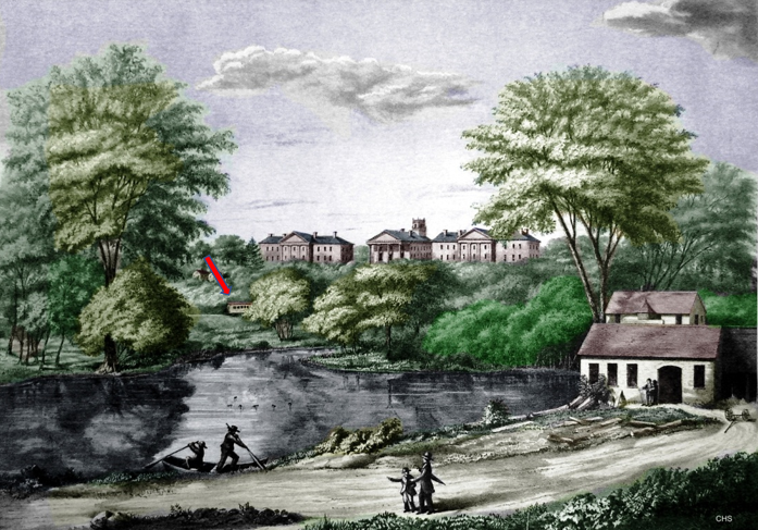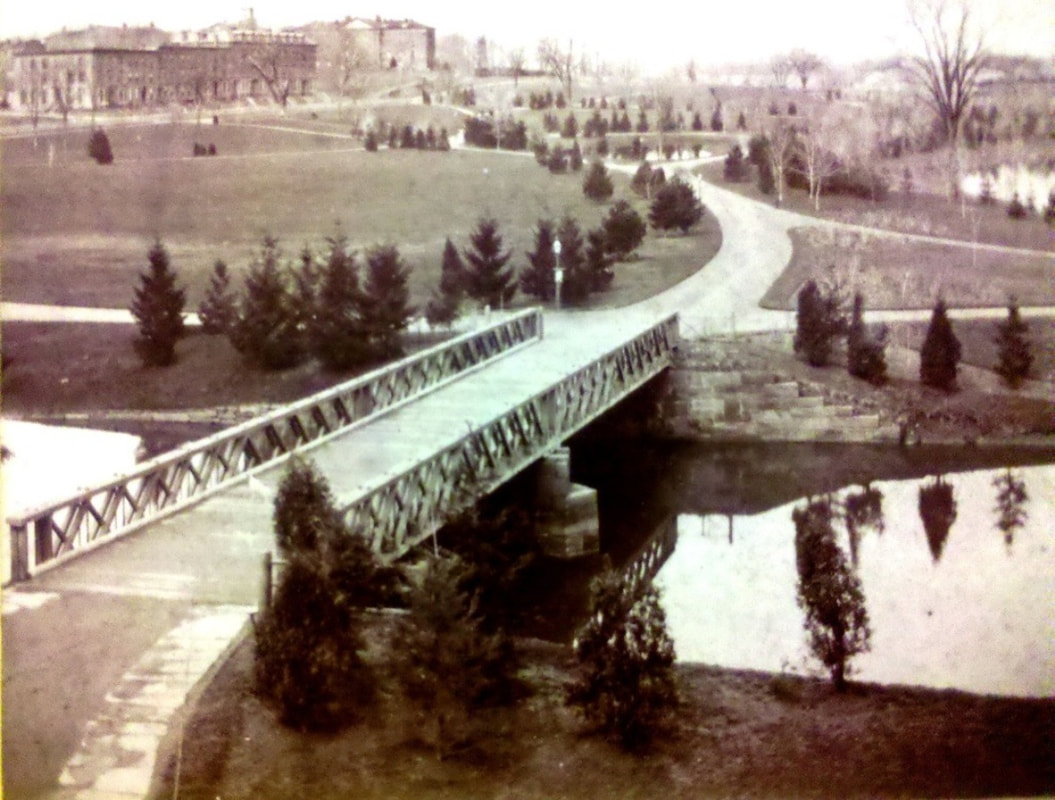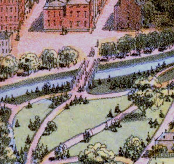 An early 1840 Courant article heralded the opening of the first station in the state capital and described it as a 60x187-ft, two-story brick structure, with an address given by the 1840GHD as 42 Mill St. A very detailed 1901 article said this depot was open for the arrival of the first train from the south on 12/13/1839 and describes the station as "an unpretentious structure... barnlike in appearance... wooden... closed in by clapboarding" and high enough in the shed part to allow passenger cars to enter. The front on Mill St. was two stories high, with a waiting room and ticket office on the first floor and railroad offices above. According to the 1839 annual report, the cost of the engine house and depot buildings, a little farther to the west, was $6,000. The image as [1] is taken from a stereograph of the 1850s. The handwriting on the left edge says "Park Depot & hotel river." Our red arrow points to what we think might be the first depot of which no other image seems to exist. Al Weaver colorized the idyllic pastoral representation at [2] which is from an 1895 periodical article. It shows the tail end of a coach on a train that is heading west from the station and about to pass the buildings of the original Trinity College standing where the state capitol is today. The 1840 article also noted the 60x225-ft bridge over the river behind the station with four tracks, two each to serve passengers and freight shipments. The map at [3] shows the layout prior to the creation of Hartford Park, today's Bushnell Park, in the area west of HARTFORD1, the title to the roadbed passing from the H&NH to the city as of 4/1/1856. In the map we see the smaller triangular 1839 track wye that enabled trains arriving from the south to pull up to Asylum St, back into the HARTFORD1 terminus, and depart the station in the opposite direction. The outer, larger wye track was built to go directly to the new 1850 Union Station, HARTFORD2. The red arrow on the map at [5], also pre-park, points to HARTFORD1, here labeled as the Welles St station in the map key. At the green arrow are the H&NH roundhouse and shops. The blue arrow points to HARTFORD2 and the larger wye to serve the track now going through the station. Recent research has clarified that the HARTFORD1 structure lasted to until 1859-1860 when it was sold and dismantled for its usable building materials. Where the four-track bridge had once crossed the river, a new Mulberry St. structure was built as an eastern entrance to the park. The snippet at [5] from John Bachmann's 1864 bird's-eye map shows the new bridge. It appears in the ca. 1880 stereo card at [6] that the original stone piers and abutments which once supported the railroad bridge were retained for the new one. Flood control projects in the 1930s buried the Park River; all that is left is a plaque commemorating the location of the first railroad station. Bushnell Park is still thought to be the first publicly funded municipal park in the country for which the famed landscape designer Frederick Law Olmstead was tapped for the original plan. The park was renamed for Rev. Dr. Horace Bushnell in 1876 to honor him for his efforts promoting the purchase of the land as a public space. The park, still an Insurance City gem, received an NRHP designation on 10/22/1970. [REFS: HNHAR4.1839.5; HDC/01/02/1840/02; HNHAR6.1841.5; HDC/01/01/1846/02; CRC4.1857.8; HDC/09/16/1847/02; SR/09/12/1850/02; HDC/07/27/1858/02; HDC/09/30/1858/02; HDC/10/09/1858/02; HDC/07/06/1859/02; HDC/01/05/1860/02; HDC/02/16/1876/02; Connecticut Magazine, v1 (1895), p68-69; HC/08/03/1901/09; HC/04/13/1930/E1; SL31.3.11][rev123113, 0514019, 012323]