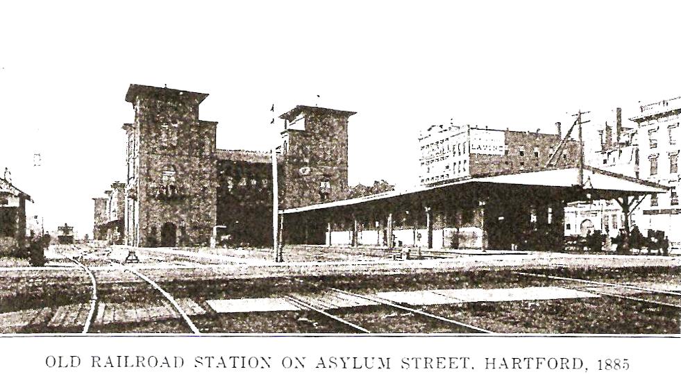 The building of this elevated station was a result of the city's insistence on the elimination of the dangerous, multi-track grade crossing on Asylum St. Construction began on 4/18/1887, it went into partial use on 5/5/1889 and it opened officially on 7/1/1889. The photo at lower left shows the elevation work for the tracks from the west underway prior to May, 1889 when some Consolidated trains first began to run into the new station. The postcard at [3] reportedly dates to 1912. Note the high, cross-gabled roof over the central part of the station in the distance on the east side of the building. In the distance in the construction shot at [4] are the old H&NH engine house and shops.