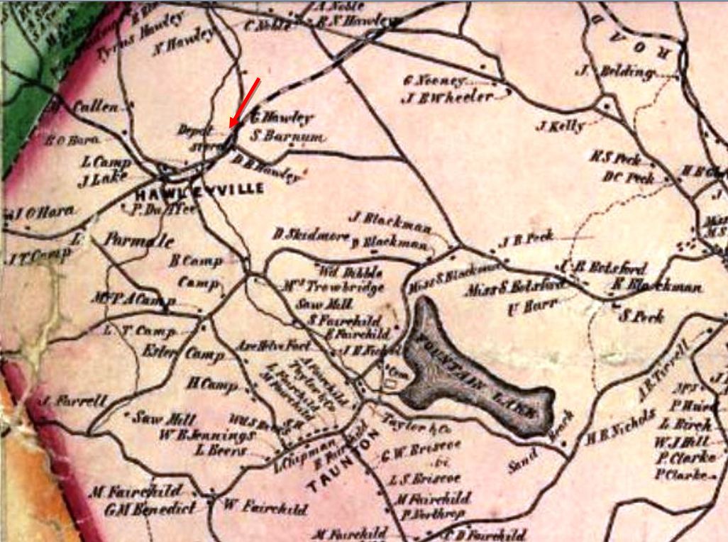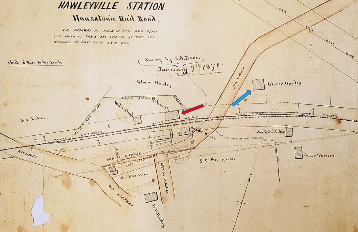 The 1840 opening schedule shows this stop in the town of Newtown listed as LAND'S END which harkens back to the early settlers acknowledging this as the end of their allotted property. As the 1856FC map at [1] shows, the first station here was west of today's Rte. 25 and stood on the north side of the original HRR track. This location is a few hundred feet south of today's railroad line which the NY&NE put through in 1881. By 1867 the Beers map at [2] shows a freight house south of the track. The best detail is given in the recently found 1/7/1871 map at [3]. The passenger station is at our red arrow and a square water tank stands just to the west. R&LHS records at the Baker Library show that Abel Drew received $25.00 on 6/25/1840 for building the tank; he may have also constructed the depot buildings. The Litchfield Republican newspaper is the first we have found to indicate a structure, saying that Gov. Seymour and "his associate State Officers... were met at the Rail road depot at Hawleyville" in 1850 to attend to funeral of Hiram Weed, secretary of the state. Glover Hawley, a prominent local resident, owned land that both the HRR and the later BH&E would purchase for railroad use. According to Beers, he was one of the "warmest supporters" of the railroad and he "piloted the surveyors through this part of the town, and gave the right of way over a quarter of a mile through his farm, also the land for the necessary depot buldings..." The 'gave' is undoubtedly euphemistic: R&LHS notes say he received $550 for a deed to "land & buildings" in 1856, perhaps for some HRR expansion at that time. We have no photo yet of HAWLEYVILLE1 which the maps show stood across the street from Hawley's house [3, blue arrow]. Perhaps it was due to him that such purpose-built structures were erected here, whereas elsewhere, e.g. STEPNEY, MERWINSVILLE, and CANAAN, the early HRR rented passenger space. Exactly how long this depot complex was in use is unclear; by 1881 all of the railroads would be sharing HAWLEYVILLE3. The Track 11 Google Earth snippet at [4] shows where HAWLEYVILLE1 stood. One of Hawley's initial conditions was that the stop be named after his family and so it came to be that the locale has been known as such for 170 years. [REFS: LR/06/20/1850/02; J.H. Beers, Commemorative Biographical Record of Fairfield County, Connecticut (1899), p1291; B774; rev080515, 060622]