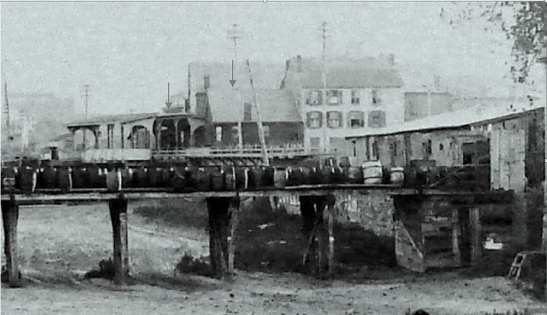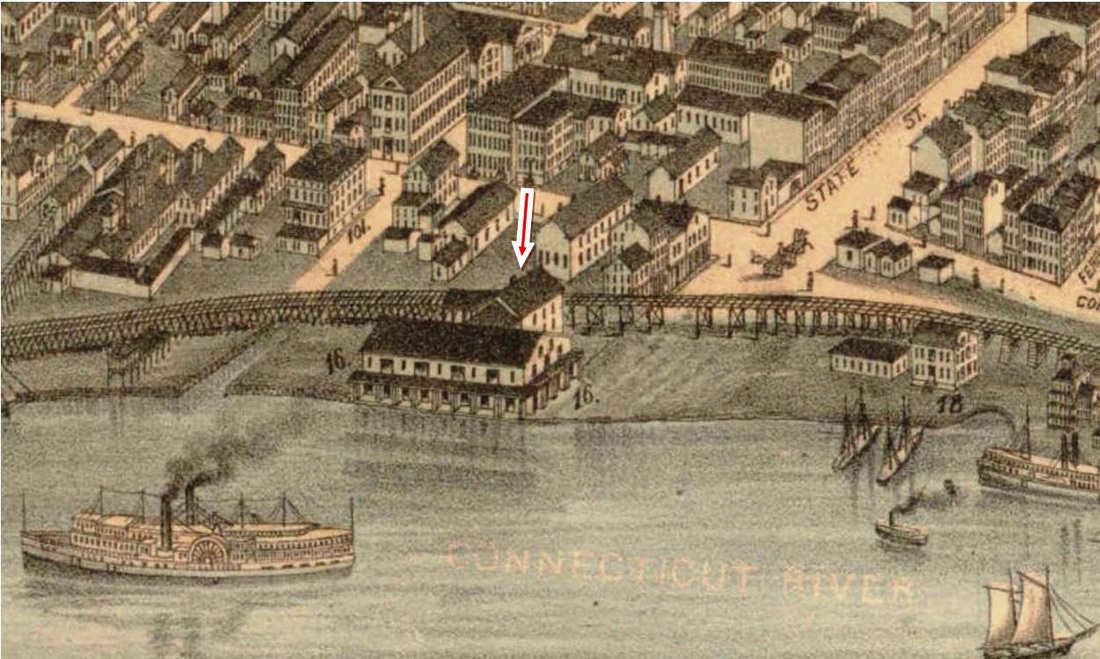 The depot at the steamboat dock, first used by the CV when it reached this point in January, 1872, is seen at locator number 16 on the map. The Hartford Weekly Times tells us that the railroad commissioners completed a 1/10/1872 inspection of the new trackage, which was mostly on pilings from Colt's Dyke to here, and noted "every post being morticed into the timbers which sustain the track bed." And further that "a very neat depot has been made at the foot of State street, by cutting the old freight house of the Hartford and New York Steamboat Company in two, and turning the halves side by side. There are large and convenient rooms for ladies and gentlemen, with a commodious ticket office between. They are warmed and ventilated, and easy of access from the foot of State street, two short flights of broad stairs leading from the street direct to the depot platform, which is built thus high to avoid the floods of Spring. In a few days trains will be running regularly to the State street depot." The side-by-side composition of the structure was either changed by the time Mr. Bailey was sketching for his map or it just was not that apparent from the outside. We do not see the stairs to the street either but we do note a passenger platform along the track to the left of the red arrow that points to the station building. The artist does realistically portray the pilings over the meadow south of the depot and the trestle supports to the north on this elevated portion of the CV. Many thanks to CNE rail historian Craig Michaelsen for sending us the HWT article! [REFS: HDC/01/13/1872/02; HWT/01/13/1872/02; HDC/03/24/1873/02; HDC/06/07/1873/02] [rev010314]