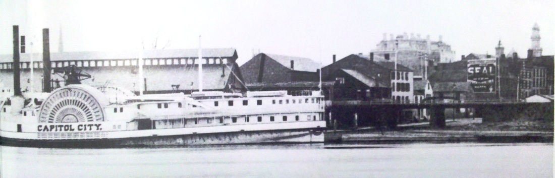 The photo at [1] shows the building that would become the CV depot for the next four decades, seemingly prior to its conversion in 1873 when the Middletown Constitution said "The Valley railroad company are cleaning out and remodeling the old brick building at the foot of State street and fitting it up for use as a temporary depot." Perhaps even more dramatic is that the photo shows box cars sitting on a trestle that dead-ends at State St. because a May, 1872 Courant article says that "a large number of workmen are engaged in the extension of the Valley road northward from its present depot. The track over State street will be supported by handsomely finished buttresses of Portland stone." Since we know that the CV reached State St. in January, 1872 and that by May of that same year they were building farther north to the junction with the HP&F/H&NH, we have a neatly delineated time frame for this historic photograph. CV trains would run to Union Station from 1872 until March, 1876, at which time, the railroad commissioners said that the CV had "abandoned" Union Station in favor of building a passenger depot at the foot of State St. While the 'abandonment' was reported correctly, the building never took place since the Courant said in 1907 that the old brick structure, which dated back to 1835, had been used as the CV depot "for nearly forty years." The article went on to say that the landmark, whose street-level tavern was frequented in the old days by Commodore Vanderbilt when he sailed ships to Hartford, had been torn down "several weeks ago," putting that event around April 3, 1907 when the new State St. station, HARTFORD11, opened. The demolition was said to be no great loss, since the depot's "dark and gloomy room" reportedly saw few patrons by that time. The 1877 Bailey map at [2] shows the building at the red arrow and the 1880 map at [3] shows the layout of the property that is prematurely attributed to the NYNH&H, which would not control the CV until 1882. The photo at [4] shows the building and the canopies [gray arrows] on both sides of the elevated track and the image at [5] captures the Capitol City at the steamboat dock. The photo at [6], perhaps ca. 1900, shows 'CVRR Station' in faded lettering. [REFS: HDC/05/10/1872/02; CR/09/28/1872/03; MC/06/04/1873/02; HDC/06/07/1873/02; HDC/06/09/1873/02; MC/06/11/1873/02; HDC/12/23/1873/02; HDC/03/13/1876/02; CRC23.1876.4; HDC/05/19/1880/02; HC/04/23/1907/03; HC/05/15/1907/15; K98] [rev010314, rrd051419, rev012723]