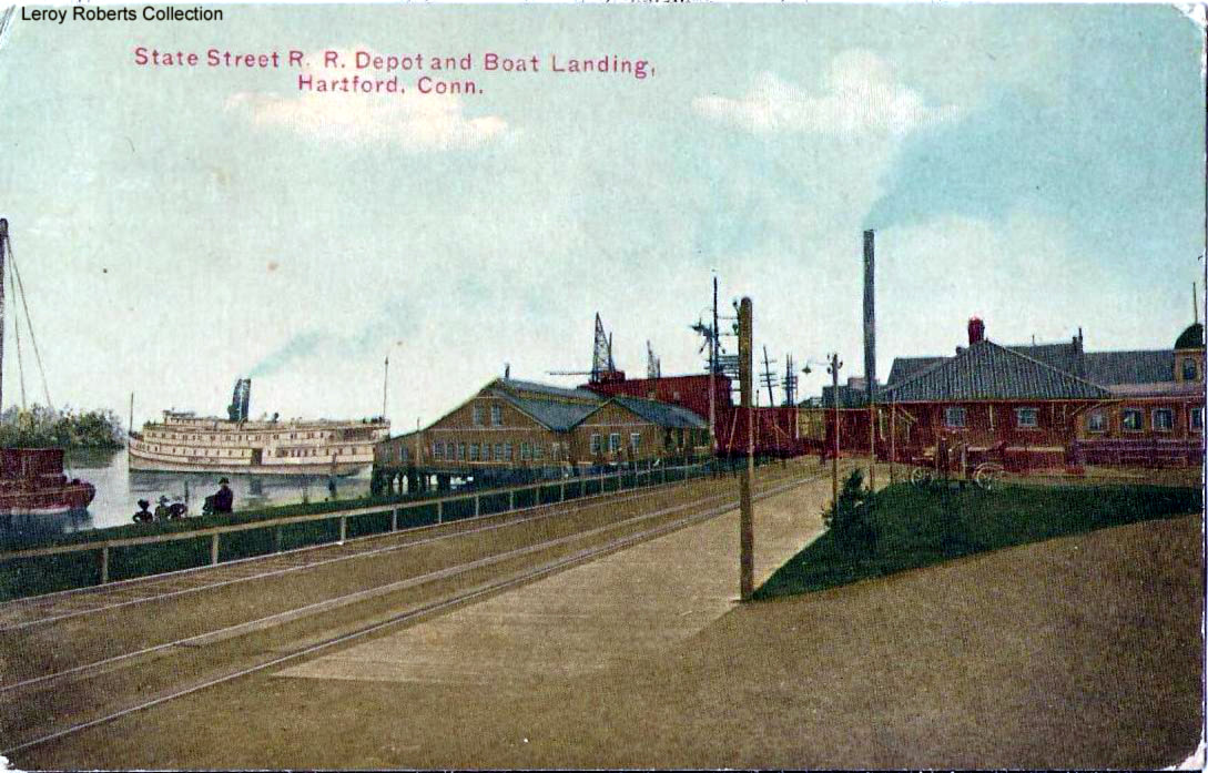 This station would replace HARTFORD5 at the foot of State St. It came about as part of the improvements underway in 1905 which included the creation of the Connecticut Boulevard that began here and ran along the river up to the new 1908 Bulkeley Bridge that crossed the river to East Hartford. The newspaper reported that the new 69x21-ft depot had a brick and granite exterior, a red tile roof, and an eight-foot overhang all around. Inside were men's and women's waiting rooms with a small baggage room on the north end. Since this structure sat at a higher elevation after the old CV trestle work had been filled in, a stairway led up from State St. up to the station which figured as something of gateway on the boardwalk that also ran north to Riverside Park. All these new amenities contributed to increased use of this station now that the dreary old HARTFORD5 was gone. The postcard above highlights the closeness of rail access to the steamboats. Water transportation, also largely controlled by the NYNH&H by the early 1900s, was still important for freight and passenger service and Hartford continued to greatly overshadow all the other Connecticut ports including New Haven where Long Wharf was already in decline. Another round of highway improvements in the form of a State St. bridge to East Hartford would doom this station, which was still standing in 1955. Dunn Bros., an East Hartford contractor, was the low bidder for the demolition work, reportedly offering to do the job for $460. Passenger service on the Valley branch had ceased in 1933 according to Karr so the station structure, however handsome when built, had languished unused for 20 years by the time the wrecker's ball swung. The Courant newspaper photo at [1] appears to look east. The view on the card at [2] looks north. The ICC valuation photo at [3] looks to be dated 8/16/1917. The image at [4] is Lewis H. Benton's number 2149, taken in 1928, likely on 6/24. [REFS: NHAR36.1907.5; HC/05/15/1907/15; HC/05/31/1907/04; HC/05/11/1955/02; K98][rev032113, 051419, 012723]
