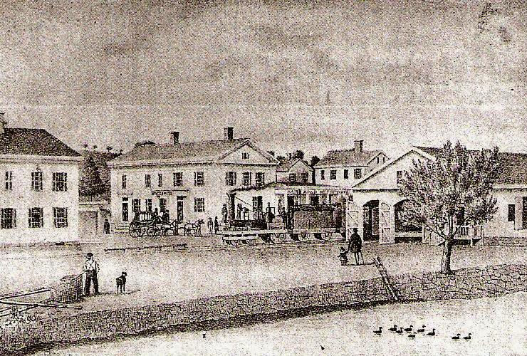 Note the early H&NH open-cab locomotive and the sign for the 'Railroad Refectory,' the station waiting room in the addition that the H&NH put on the hotel that is seen behind the train. This building was known first as the Meriden Hotel, as this 1842 woodcut is dated, and would later become the Conklin Hotel. Rockey and some other sources say that the first station was in the Rogers block. That was also a hotel, just out of sight to the left on the south side of Main St., which would serve as a station later when the Conklin Hotel burned in the mid-1840s. [rev112018]