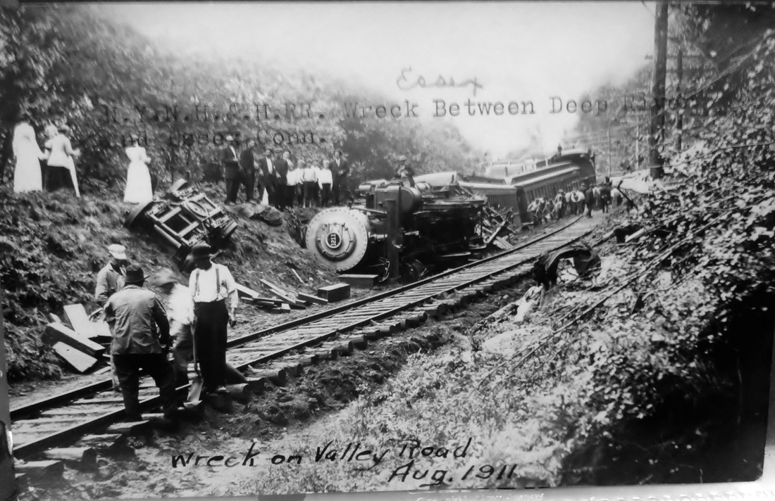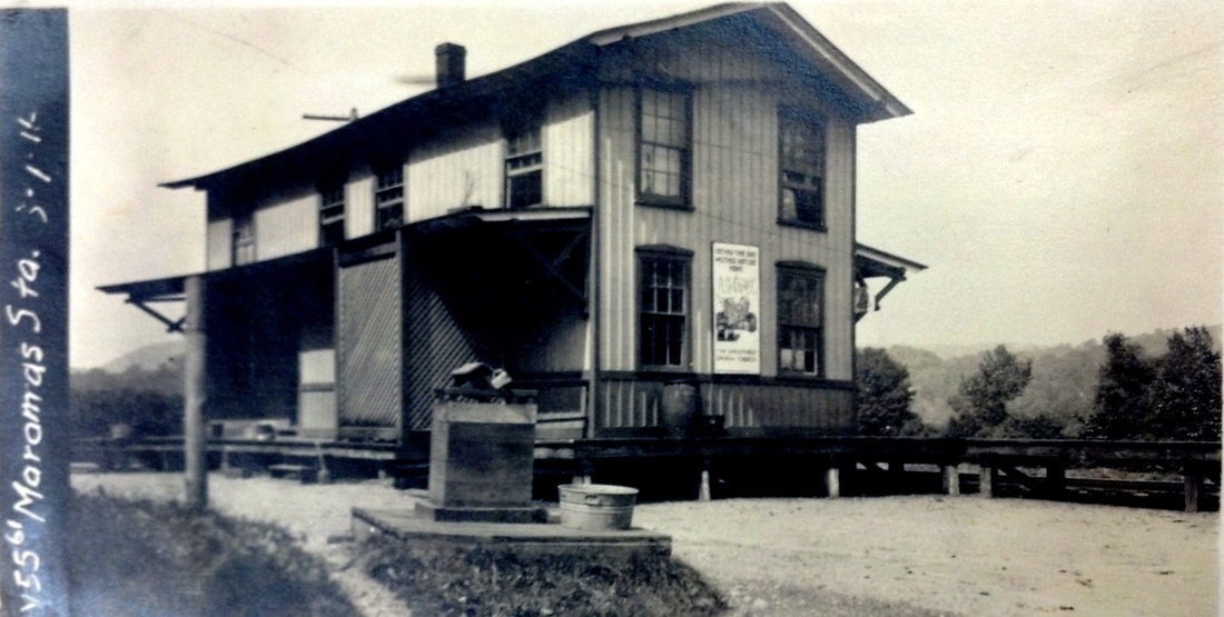 In 1905, a falling out with Merwin's son-in-law, Ed Hurd, who had taken over as station agent, caused the railroad to put a ticket office in the freight depot just south of the hotel and make that the new railroad station. The Merwinsville Hotel Restoration website [click here] says incorrectly that the converted freight depot was torn down in 1915. In fact, it was moved at that time to become LIME ROCK2, as shown in this photo, after the previous station there burned. We are keeping an eye peeled for a shot of this structure with a MERWINSVILLE signboard. [REFS: R54]
