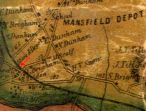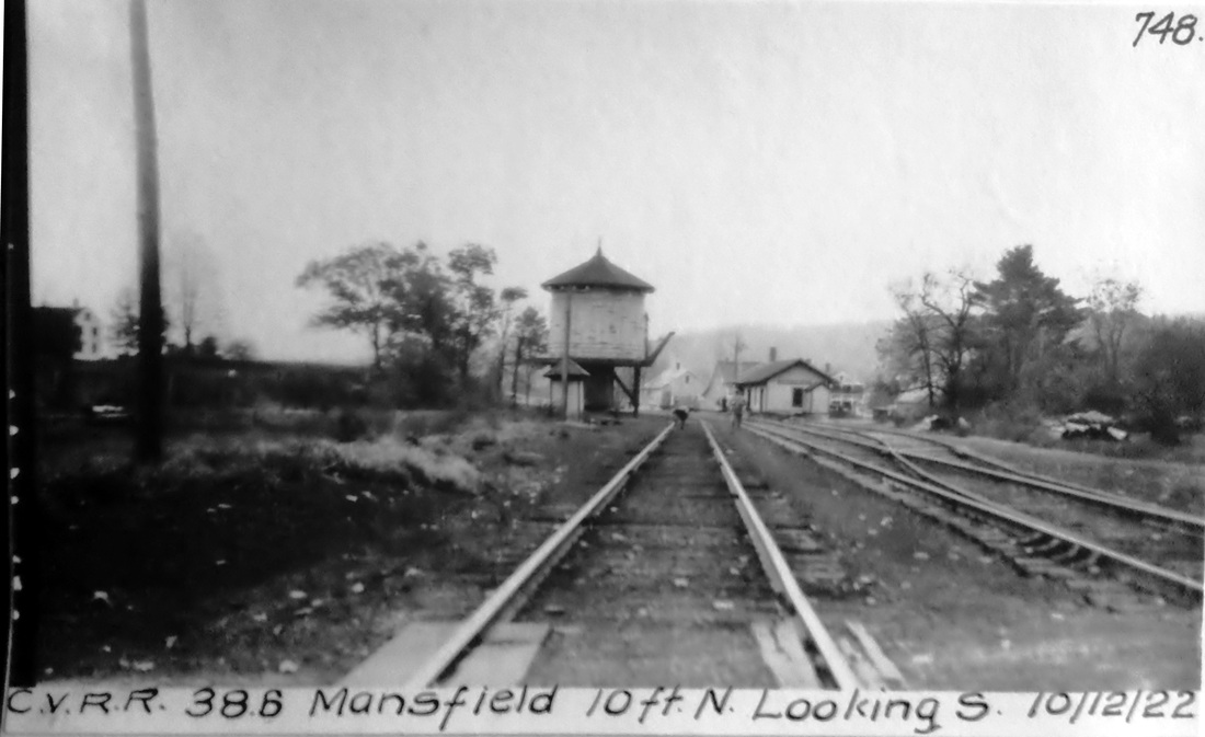 This stop in the town of Mansfield was established in 1850 by the NLW&P. The location is seen on the 1857TC map with the village called Merrowville. We do not see any signboard but this structure is accepted as the station, probably the first although the details here are sketchy. An entry in the journal of Mansfield resident William Reynolds gives the events of 3/26 and 3/27/1877 as... "heavy rain wind, great flood, a 300 A. [acre] resavoir [sic] at Staffordville gave way and every dam and bridge on the river below carried away as far down as Merrows Station. Twenty five buildings carried off including a bank, meeting house, railroad depot, stores, dwellings. Damage $300,000." Assuming the building in the photo is the first depot, this is the one that was washed away. [REFS: 03/28/1877/02][rev092317]